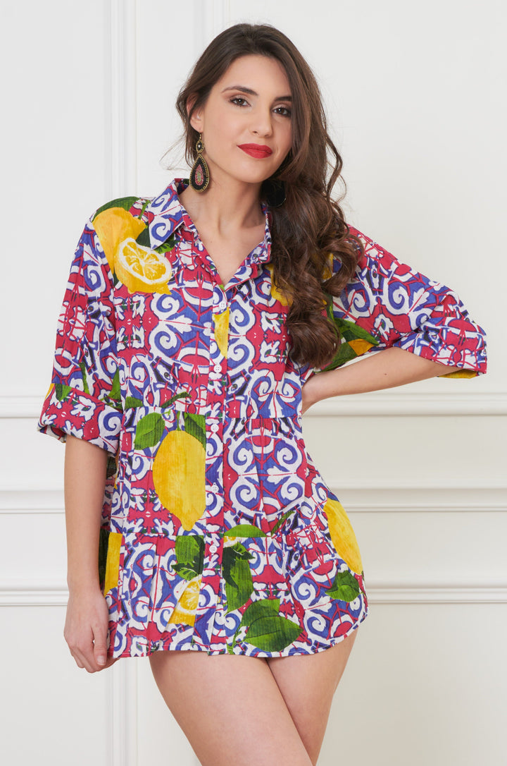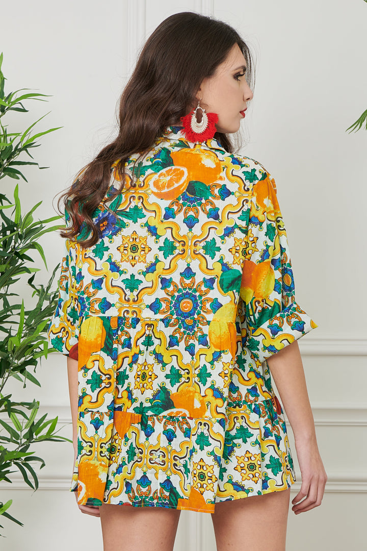 This elegant shirt is made of pure cotton and features 3/4 sleeves and a front button closure. The high-quality fabric ensures comfort and breathability, while the flared hem and the pattern make each piece unique. Perfect for a refined and unique look.