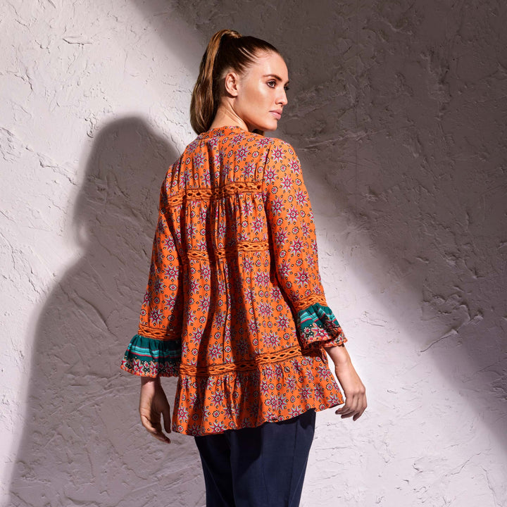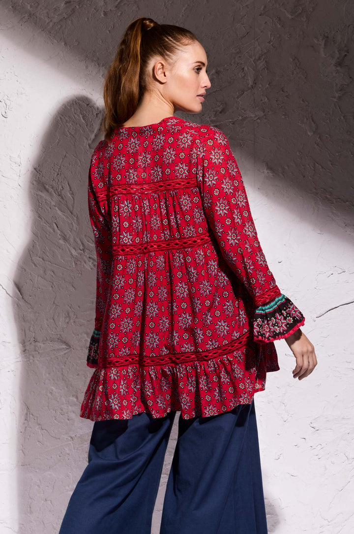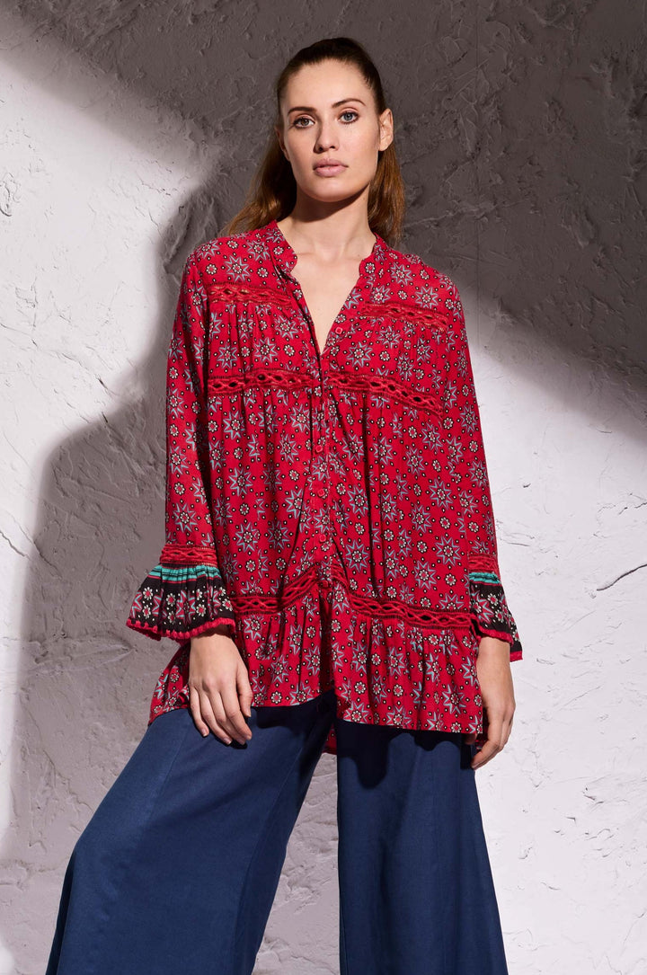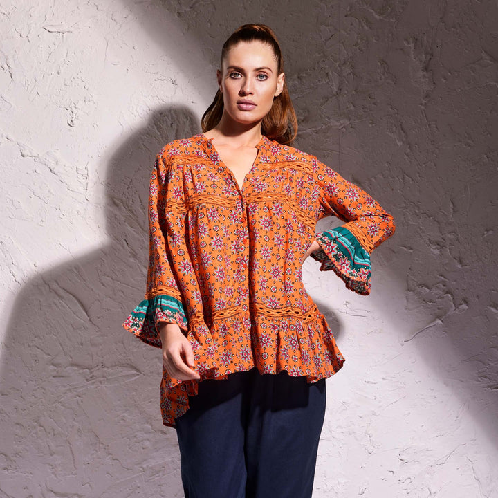 Discover the elegance of the Isla Mujeres Blouse. With a V-neckline and long ruffle sleeves, this blouse adds a touch of sophistication to your look. The inlaid lace inserts and the ruffle at the bottom give a touch of femininity. Perfect for a special occasion or for an everyday touch of class.