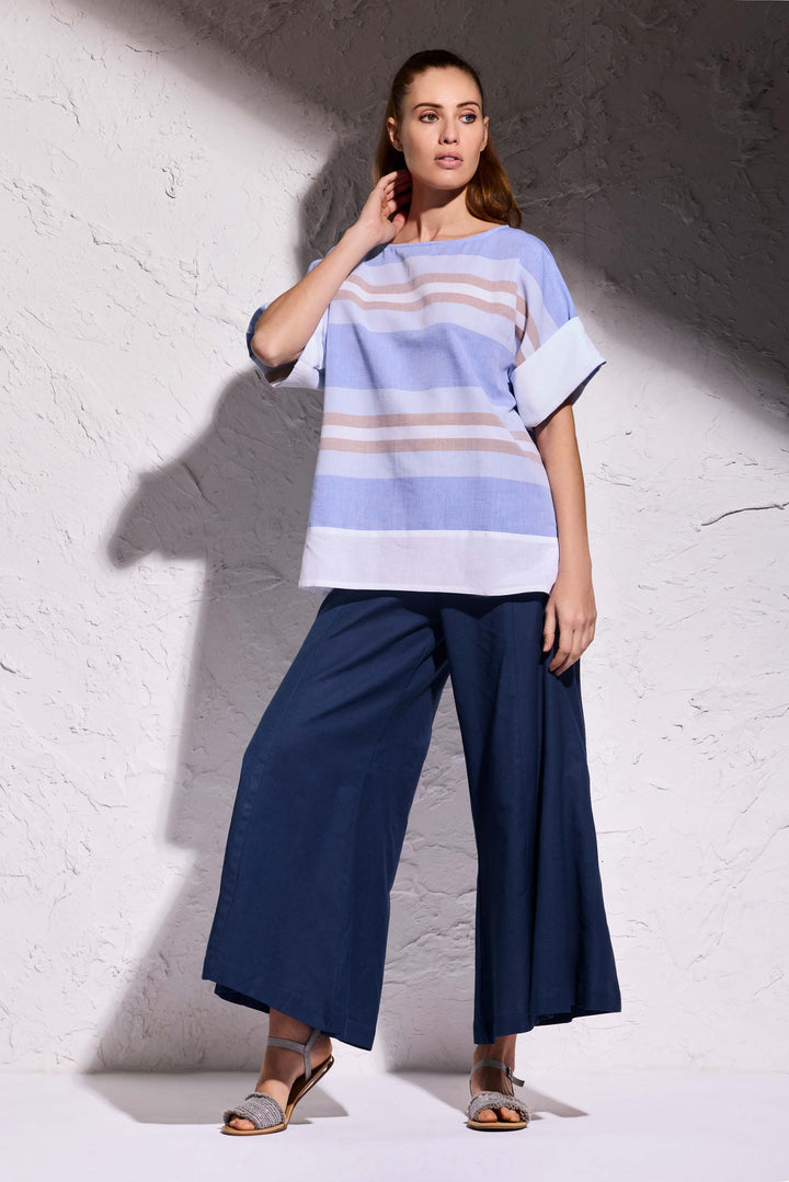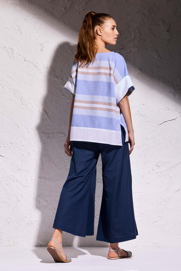 The Palazzo Lino Trousers are the perfect choice for a fresh and fashionable summer look. Made from a soft cotton and linen fabric, these trousers feature a palazzo style and a button closure for a comfortable fit. Add a touch of elegance to your wardrobe with these uniquely designed trousers!
