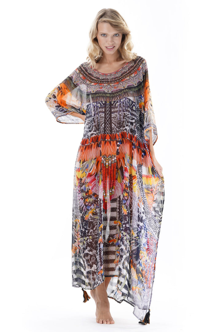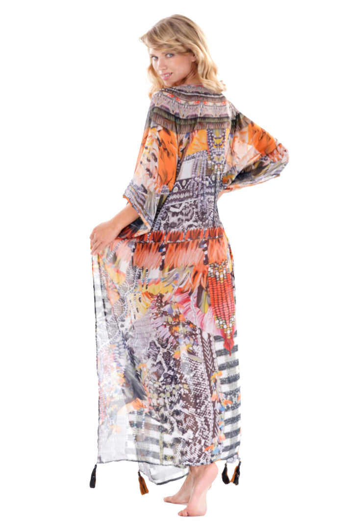 This long poncho, featuring side slits for greater freedom of movement, has decorative tassels on the hem that add a distinctive and dynamic touch. The multicolored pattern completes a versatile and refined garment, perfect for those seeking style and elegance on every occasion.