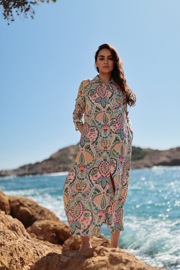 Dress chemisier with floral print. Fluid drape. Notched collar. 3/4 sleeves. Front opening with buttons. This model is very versatile. You can wear it loose or with a belt to fit your silhouette.
