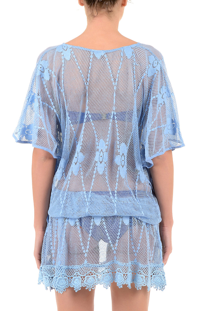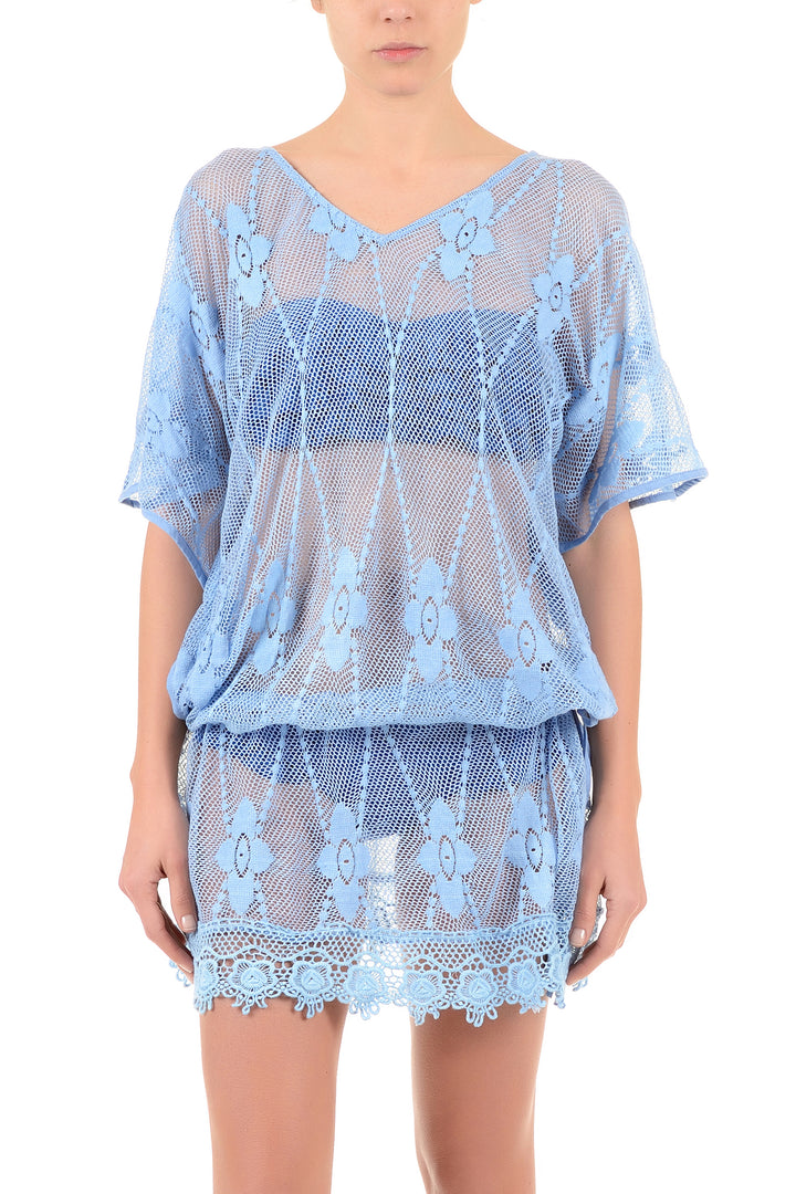 This pure cotton dress combines comfort and refinement thanks to the V-neckline and lace and sheer details. The light blue shade gives freshness and versatility, perfect for an elegant and distinctive look. An ideal garment for those seeking elegance without sacrificing material quality.