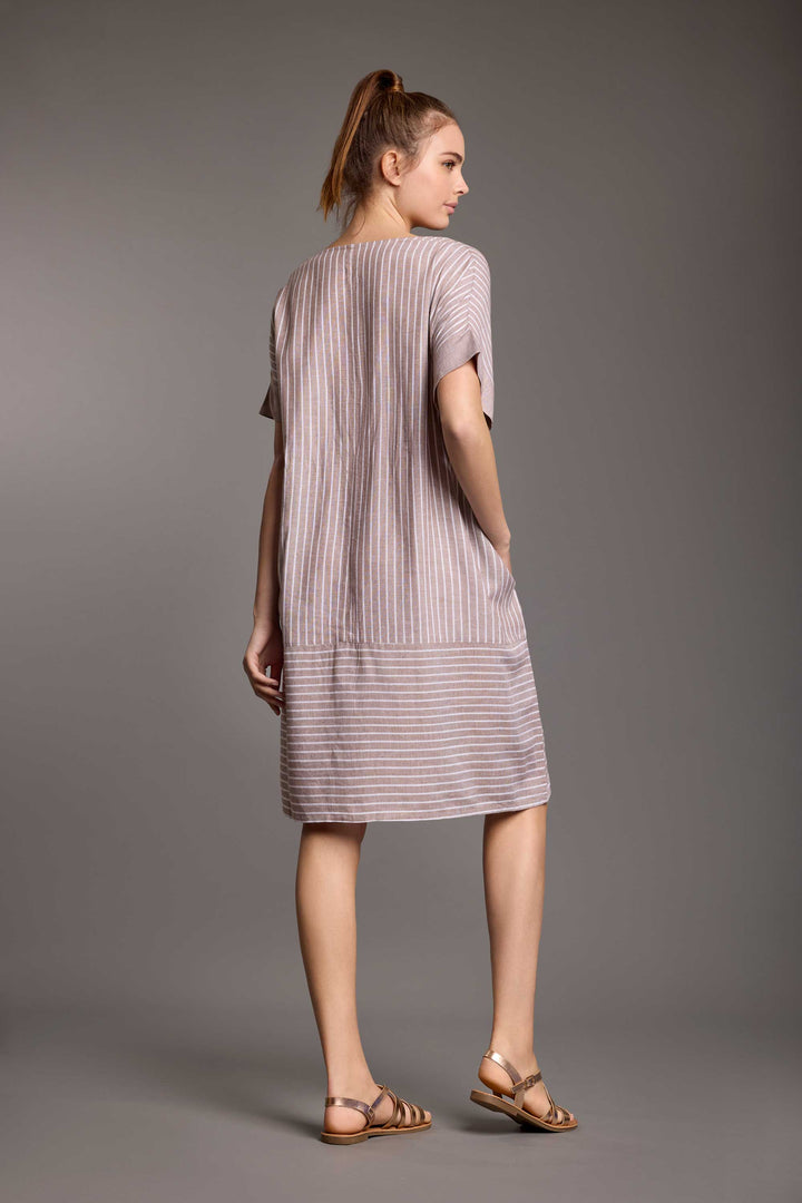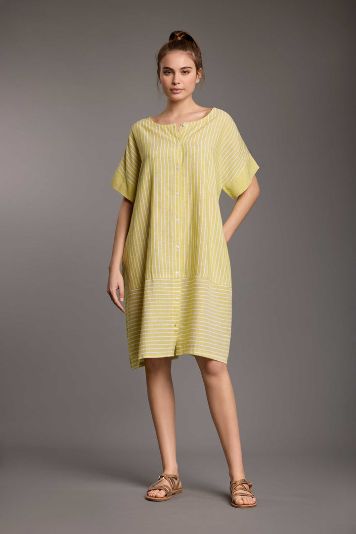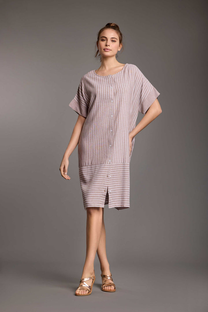 The Nives dress in linen blend is perfect for summer, thanks to its comfortable loose fit. Its elegant pinstripe pattern and front buttons make it ideal for both casual and elegant looks. With short sleeves and lightweight fabric, it will be your ideal companion on warm summer days.