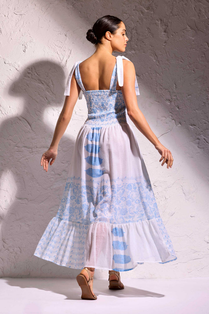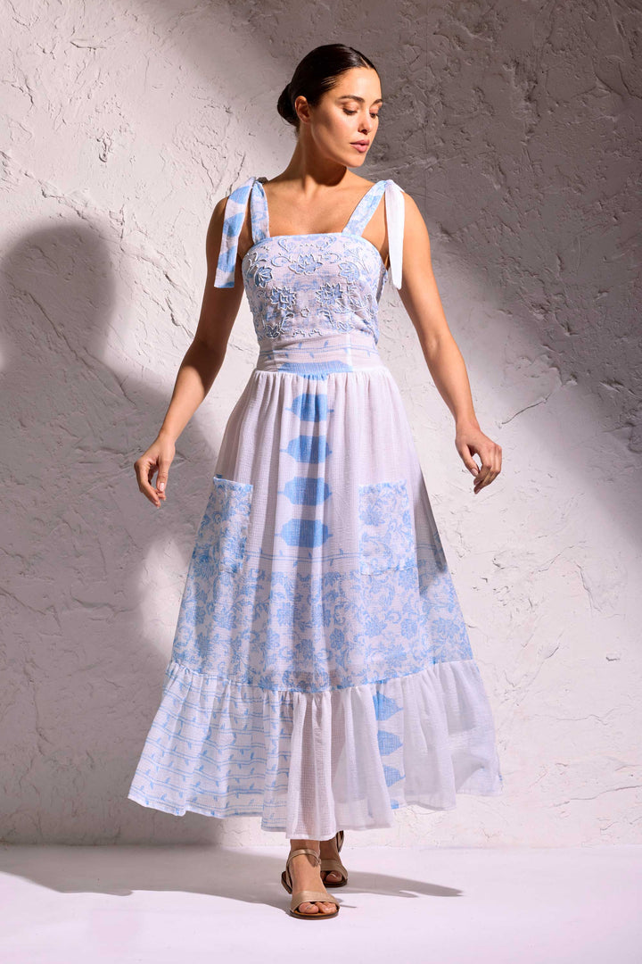 Discover the long dress with straps Nereidi in pure cotton. Perfect for fresh and summery looks, the simple design makes the dress versatile for any occasion. With ruffles on the skirt and straps with a knot, it adds a touch of freshness and versatility to your style.