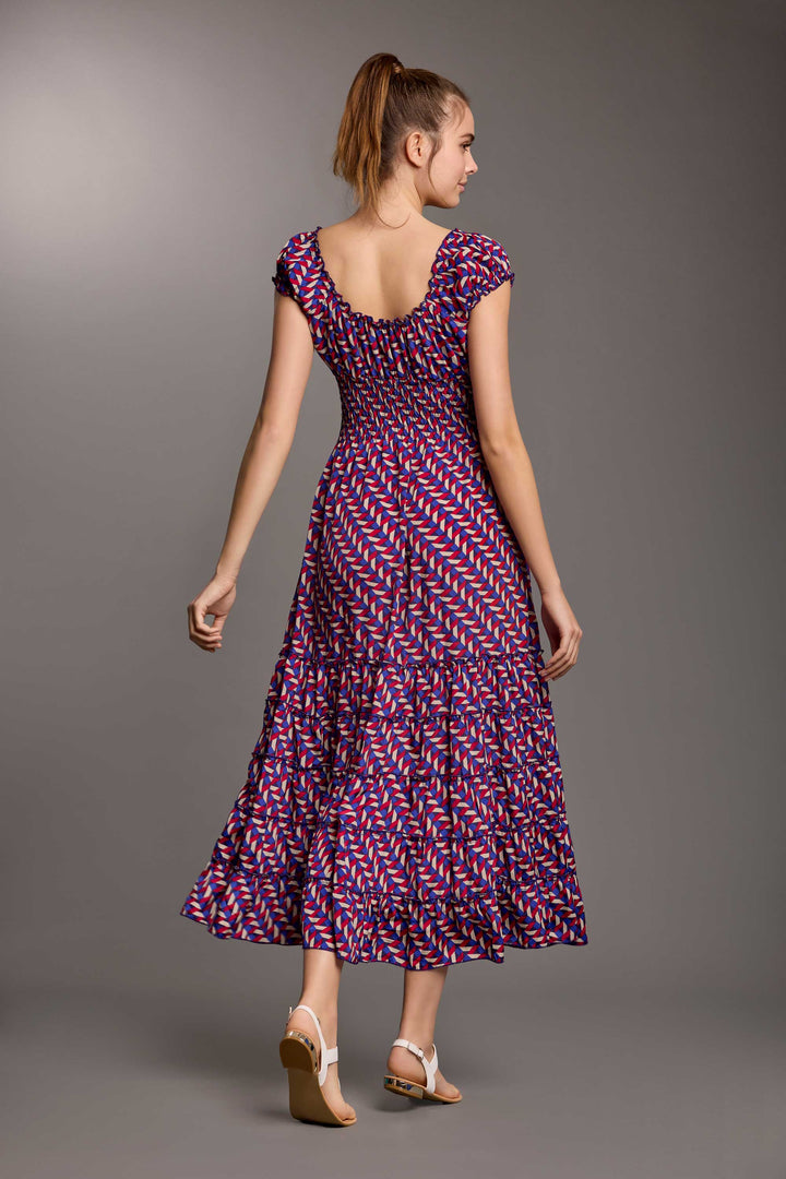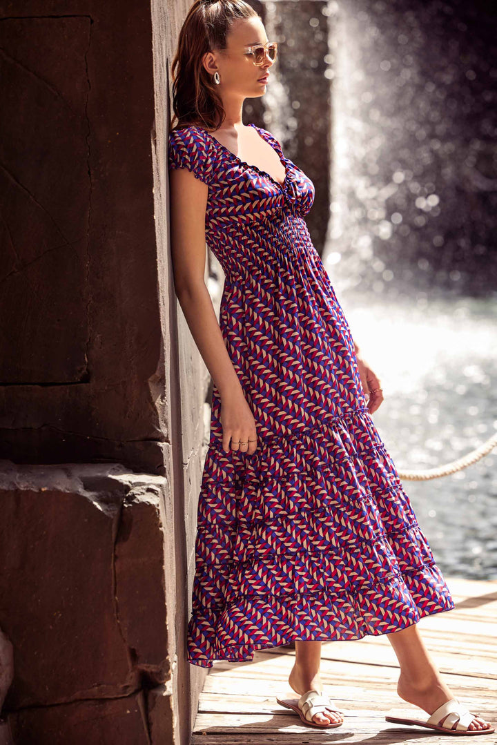 The long dress Serena is the perfect mix of elegance and comfort. Thanks to its multicolored design, made of soft and silky fabric, it is ideal for special events or sunset dinners. With the elastic bodice and the skirt with ruffles, it offers a sophisticated style and a comfortable fit.