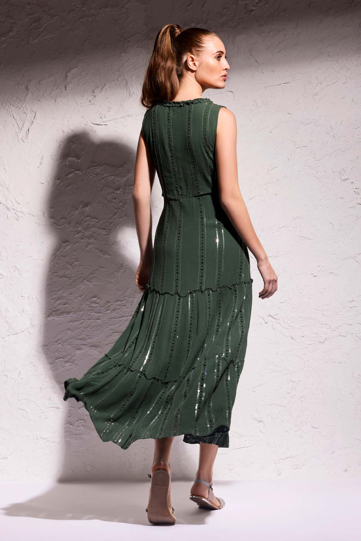 This long green dress with inlays is made from a unique fabric featuring hand-embroidered sequins. Its long, sleeveless design makes it extremely versatile, suitable for various occasions. With a ruffled skirt and a deep V-neckline, it offers a unique elegance.