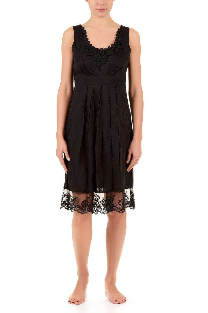 This sleeveless dress, made of pure cotton, offers ideal comfort and breathability for hot days. The lace inserts on the hem add a touch of elegance and refinement, making it perfect for both casual and more sophisticated occasions. A versatile garment that combines style and practicality with quality craftsmanship.