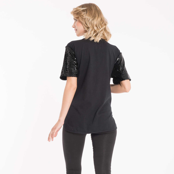 Short-sleeved T-shirt with round neckline, sequins, and central writing.