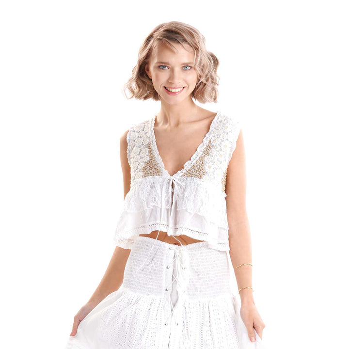 This elegant sleeveless top made of pure cotton is ideal for hot summer days. The adjustable tie allows you to customize the fit according to your preferences, ensuring comfort and freedom of movement. A versatile and refined garment, perfect to wear at the beach or in the city for a casual chic style.