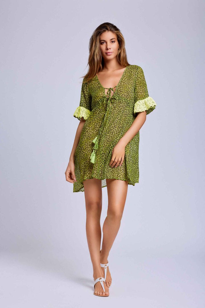 This pure cotton dress is perfect for summer. With a touch of romance thanks to the short sleeves with lace ruffles and the collar with a lace and tassels, the green spotted pattern makes it unique and modern. Try it for a fresh and trendy look.