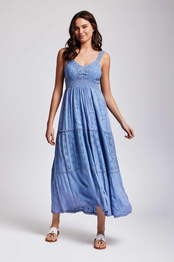 Immerse yourself in elegance with our Lia lace maxi dress. Fine lace and Sangallo lace come together in a maxi dress with fitted top and waist , lace armholes and neckline. The ruffled skirt adds a touch of grace to your look.