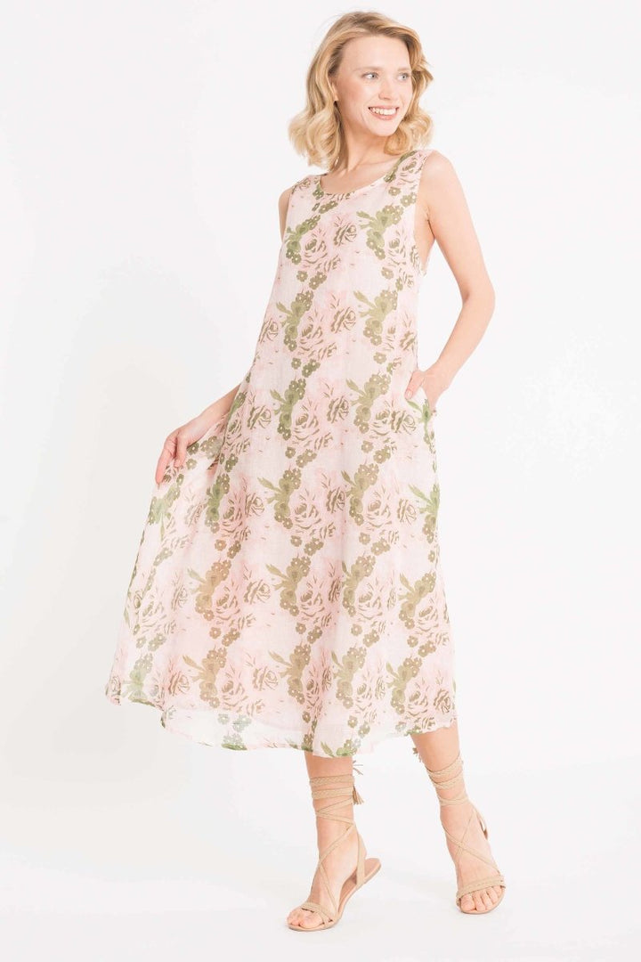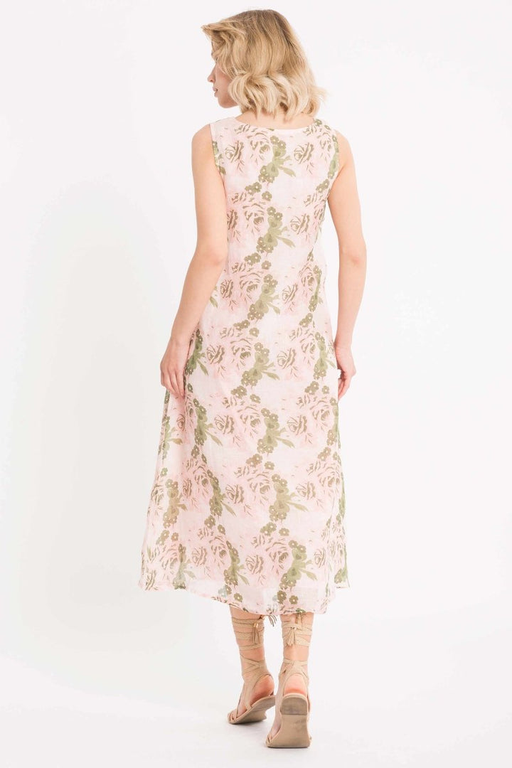 Long dress in pure linen, sleeveless and perfect for summer days. Its delicate floral pattern adds a romantic and fresh touch, while the linen fabric ensures a feeling of lightness and comfort. A versatile piece that can be worn alone for an elegant and relaxed look or paired with accessories for a more sophisticated outfit.