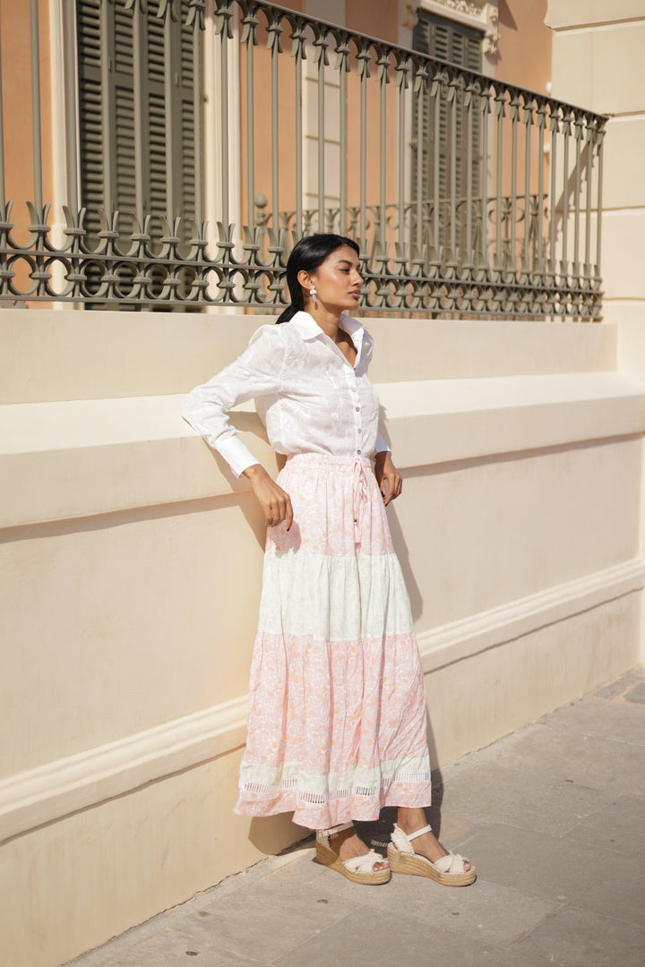 Discover the beauty of this long skirt, made of pure cotton to ensure comfort and durability. The long model is perfect for summer days and the elastic waist adapts to every silhouette. The delicate pink color and the elegant pattern with inlaid lace inserts will always make you feel on top.