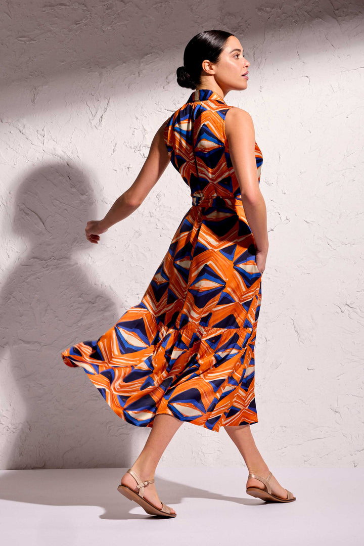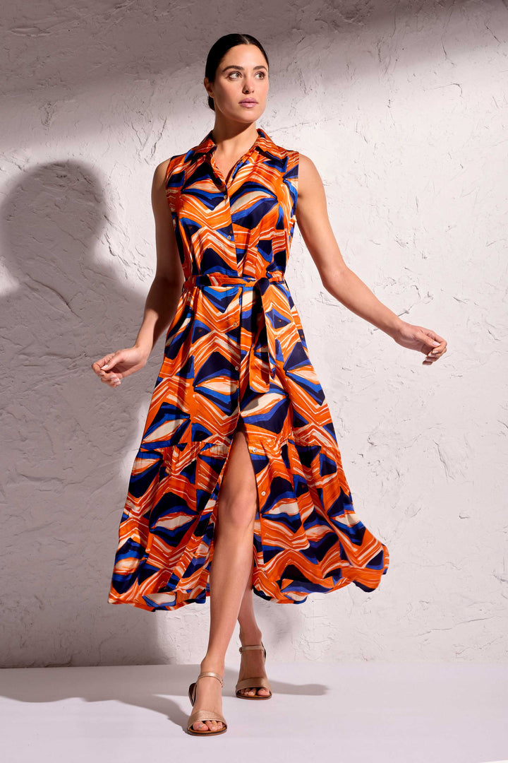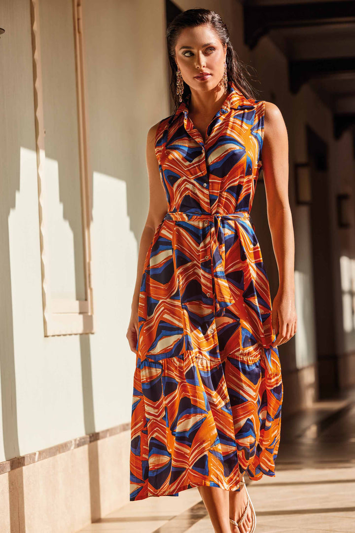 The long shirt dress Charlotte is an ideal summer choice for those who love comfort and style. Made from soft multicolored viscose and modal, this sleeveless dress stands out for its modern design and eye-catching print. With a removable belt, it is perfect for wearing in the city or at the beach.