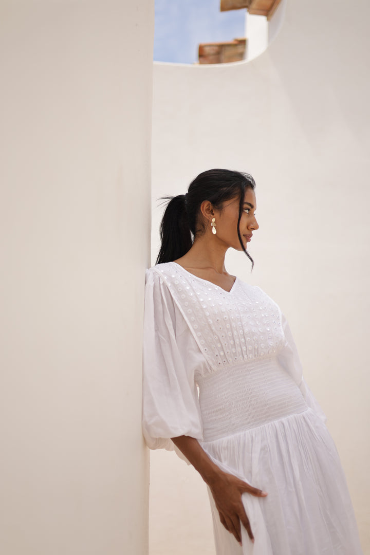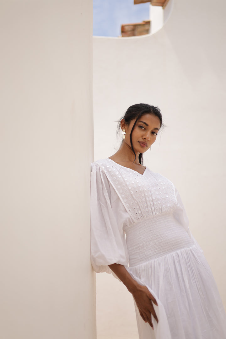 This Formentera long dress is made of pure cotton, ensuring comfort and breathability. The long model is perfect for summer days, while the puff sleeves and embroidered inserts add a touch of style. With an elastic waist , this dress adapts perfectly to all body shapes.