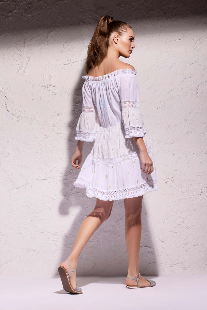 Add a touch of elegance to your wardrobe with this pure cotton and Sangallo lace dress. With ¾ sleeves and inlaid lace, this dress is perfect for any occasion. Its adjustable boat neckline makes it chic, refined and versatile. Medium length.