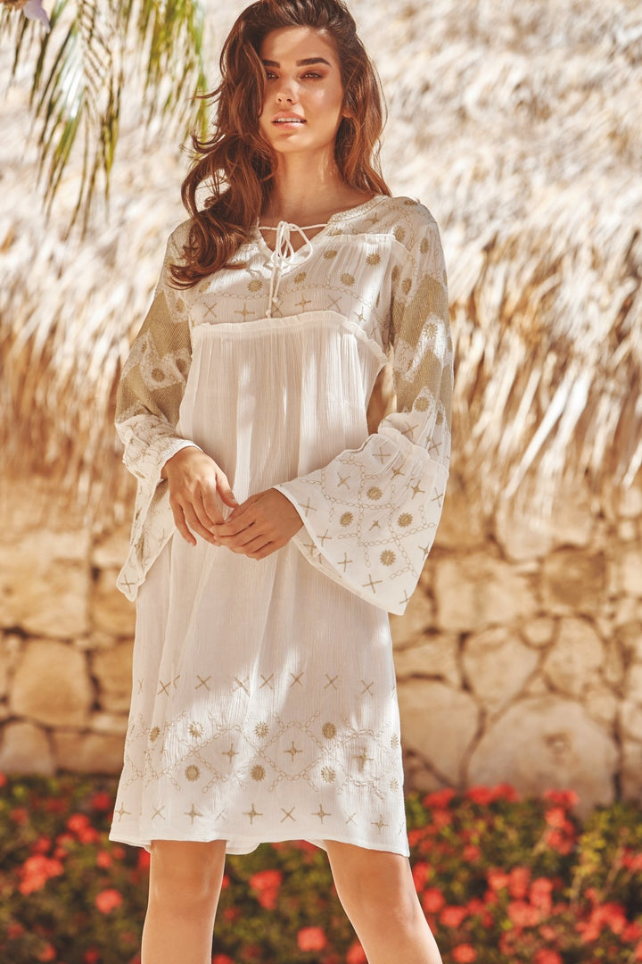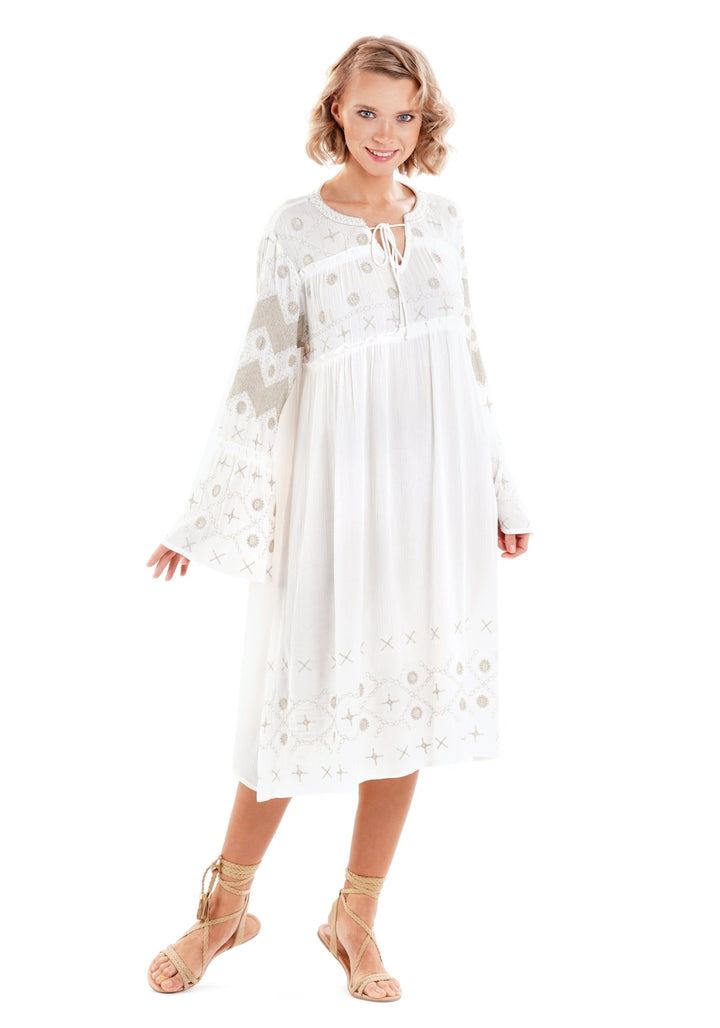 Product description: Exclusive long dress with delicate mini ruffle applications and voile sleeves, perfect for an elegant summer evening. The white color and sand embroidery make it unique and refined. Add a touch of luxury to your wardrobe with this dress with a sophisticated vibe.