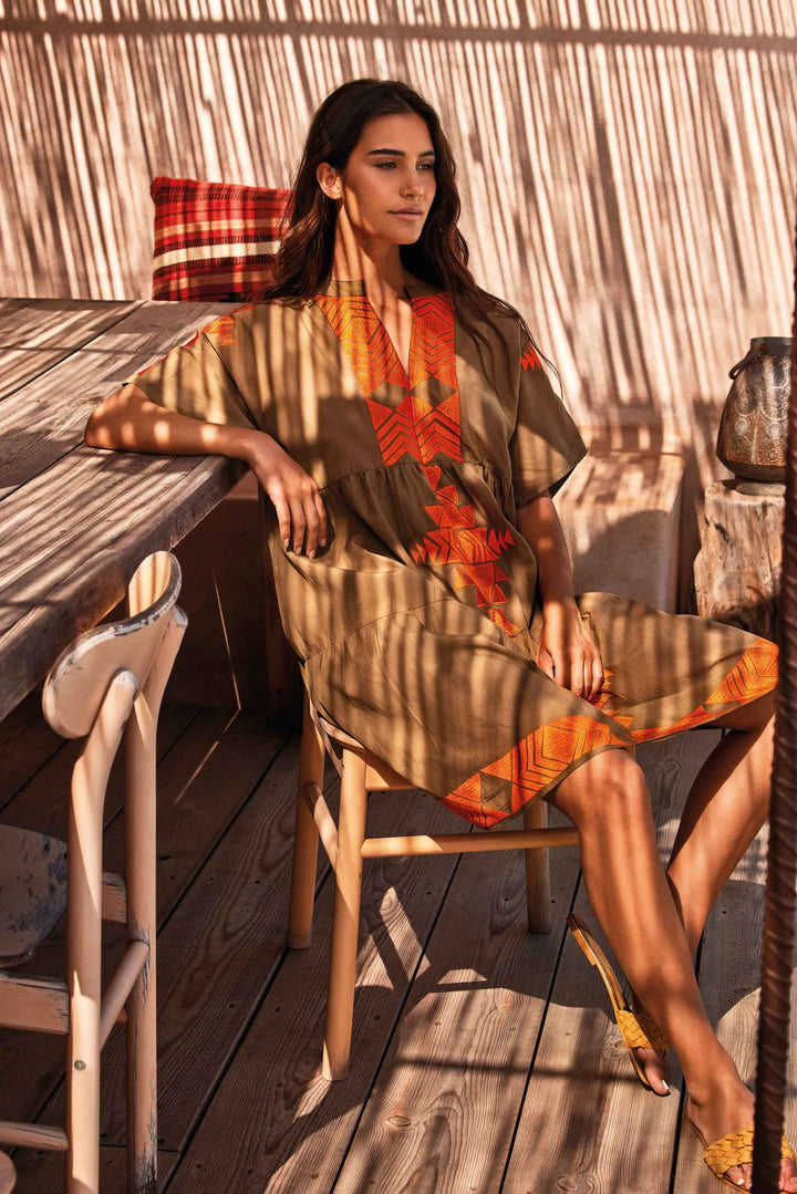 The Ambra Caftan is a versatile and comfortable piece of clothing thanks to the pure cotton fabric. The short sleeves and raised collar make it perfect for the hottest days. The ethnic-patterned neckline and ruffled skirt add a touch of unique style, perfect for those who love original and colorful looks.