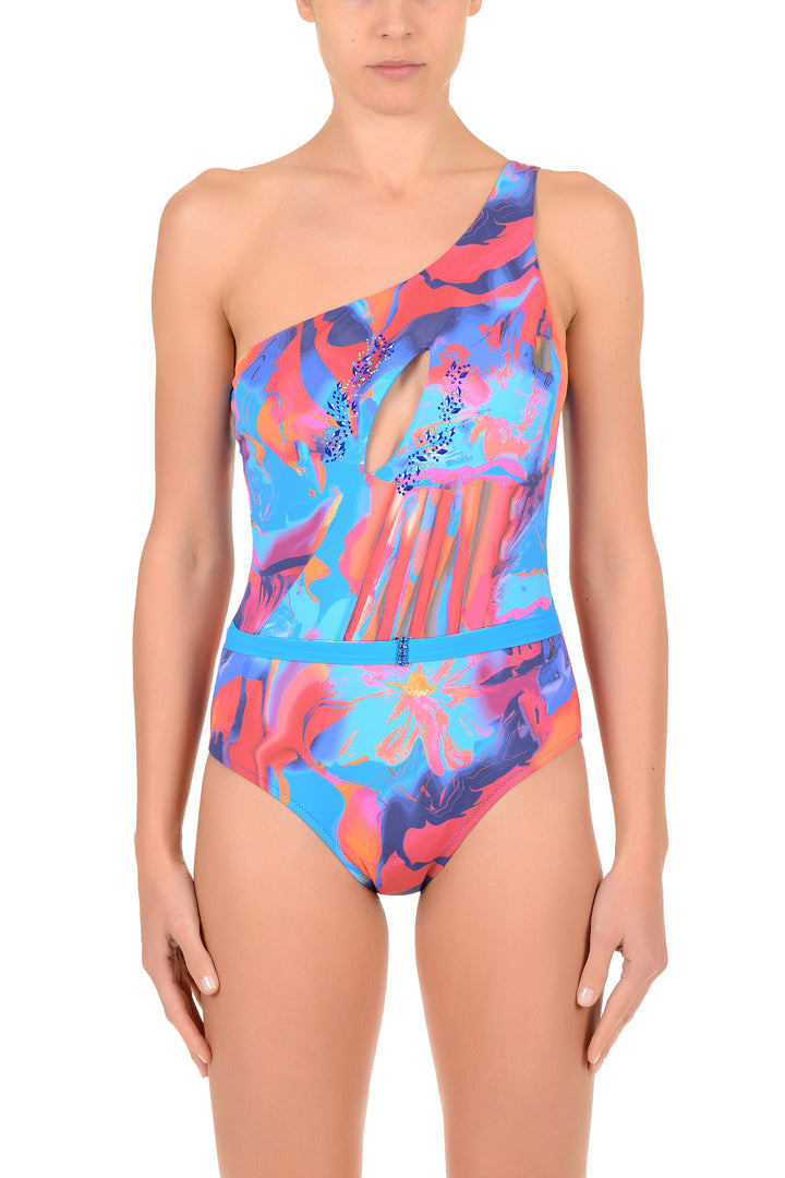 This one-shoulder one-piece swimsuit combines elegance and comfort thanks to its asymmetric design. The refined pattern enhances the silhouette, offering a sophisticated look ideal for those seeking style and practicality at the beach or pool. Made with high-quality materials, it ensures a perfect fit and long-lasting durability.