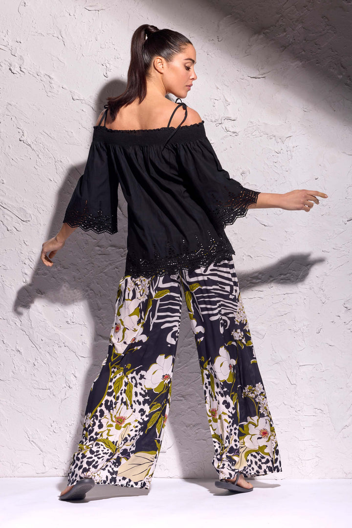 Palazzo pants, comfortable and fresh, with a perfect blend of pattern and animal print. Ideal for a sophisticated and relaxed look.