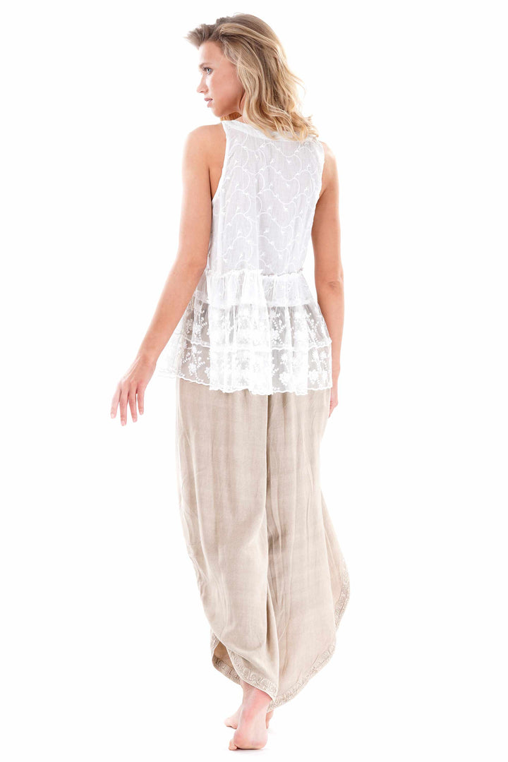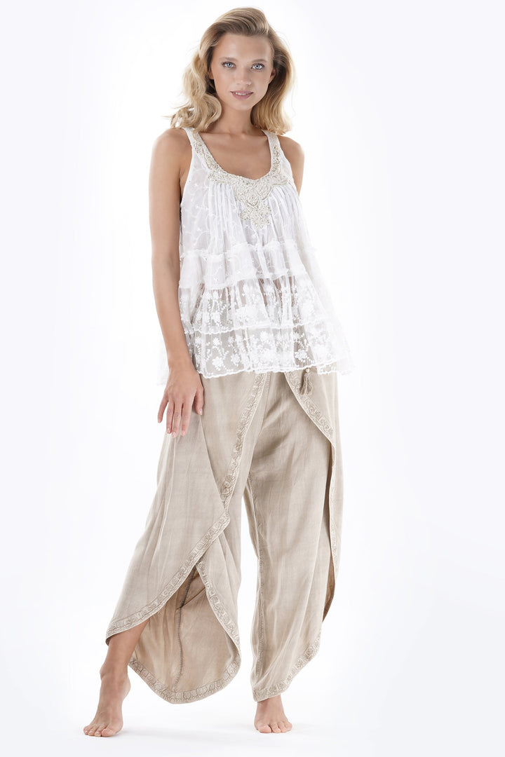 These pants stand out for a refined V-cut that elegantly enhances the silhouette. Enriched with delicate embroidery, they offer a distinctive touch without sacrificing comfort. Perfect for those looking for a versatile and detail-oriented garment.