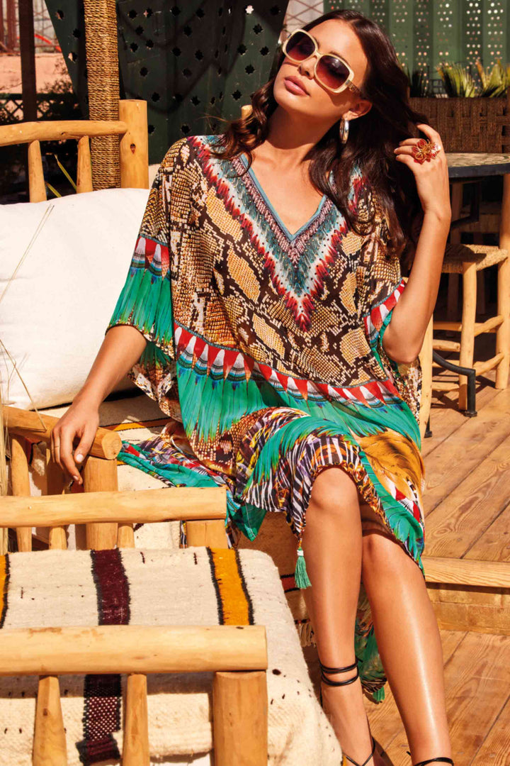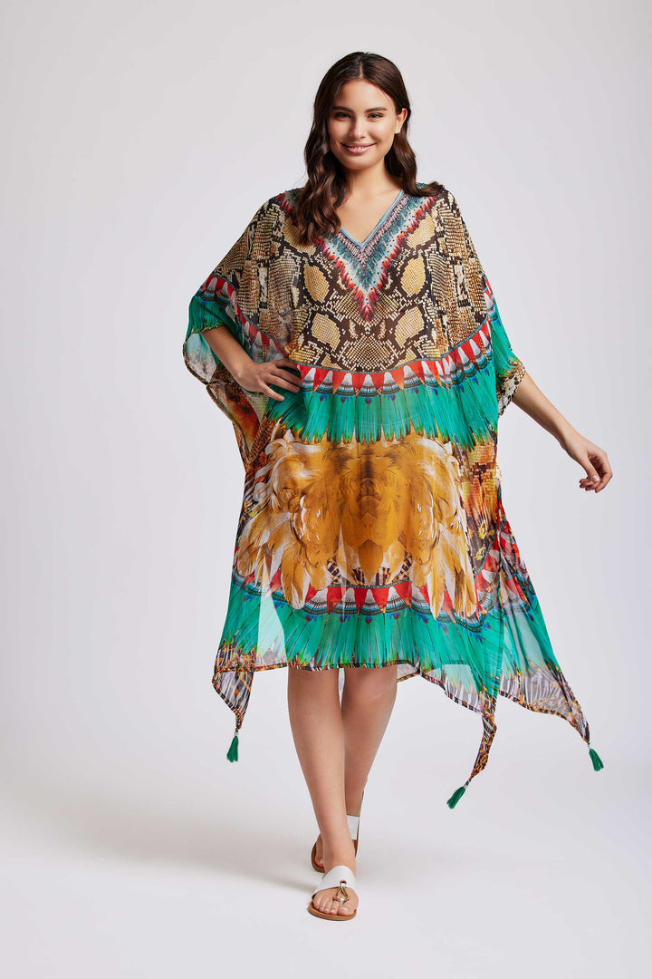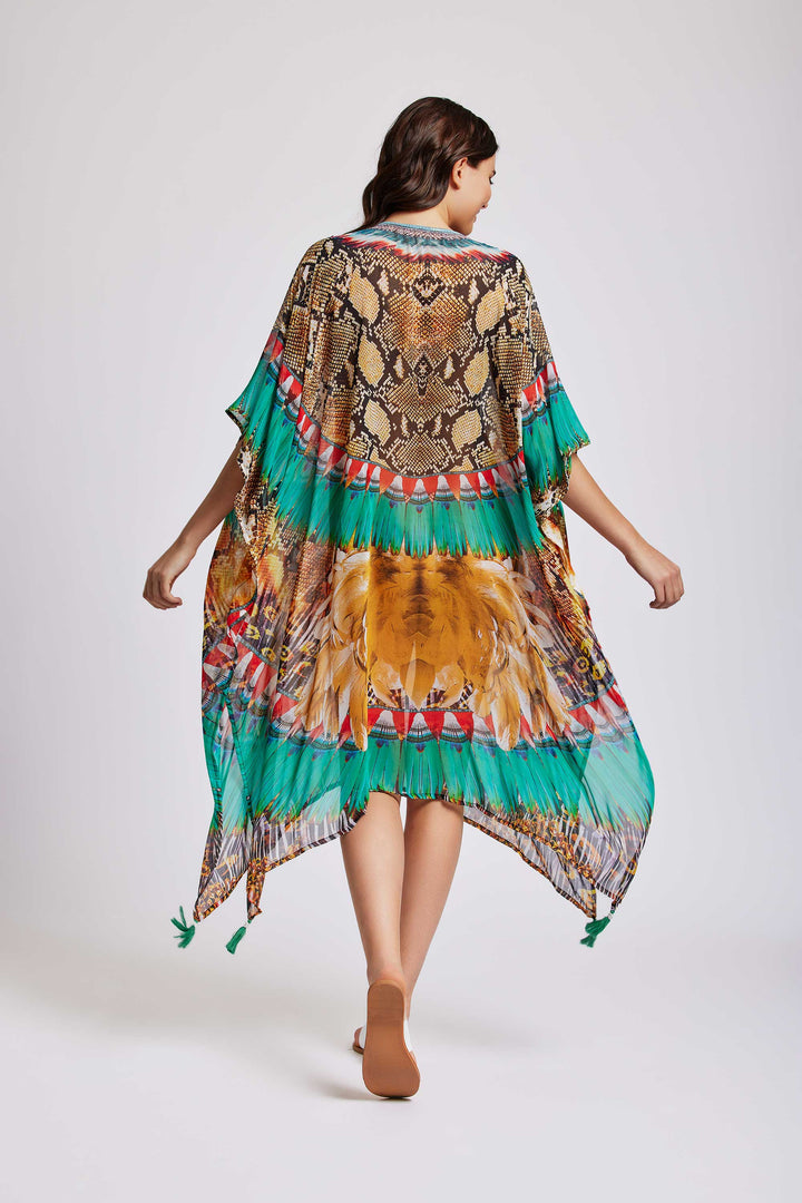 Wrap yourself in luxury with this Animalier Floral Long Poncho. Crafted with a unique floral animal print and hand-stitched crystal detailing, this poncho will add an artistic touch to your wardrobe. With a V-neck and batwing sleeves, this piece is both elegant and comfortable. Complete the look with tassels at the ends.