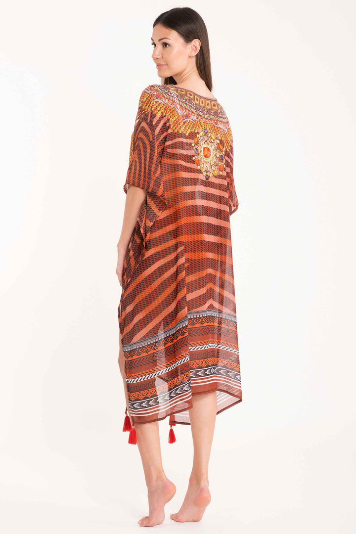 This versatile poncho with a V-neckline enhances the décolleté and offers sophisticated elegance. The characteristic side slits adorned with tassels add movement and a bohemian touch to the garment. Ideal for seasonal transitions, it is easily worn over any outfit for a refined and contemporary effect. An essential piece that combines comfort and style without compromise.
