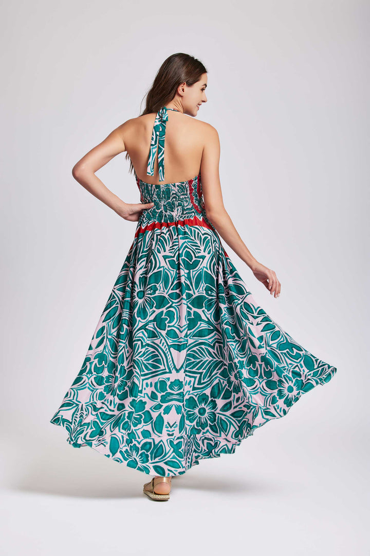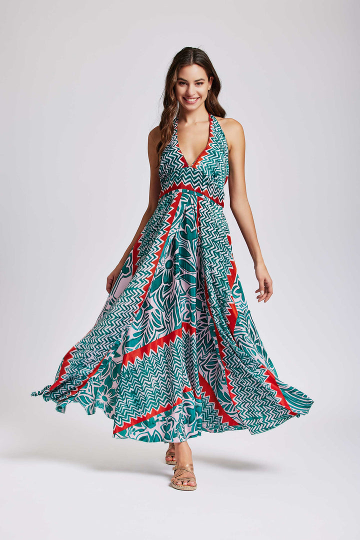 Enhance your elegance with the Emerald Halter Neck Dress . The long model, with a deep V-neck, enhances your décolleté. The emerald-toned print adds a touch of color to your figure. The wide skirt with double layer and wavy flounced bottom guarantees a fluid and sinuous movement.