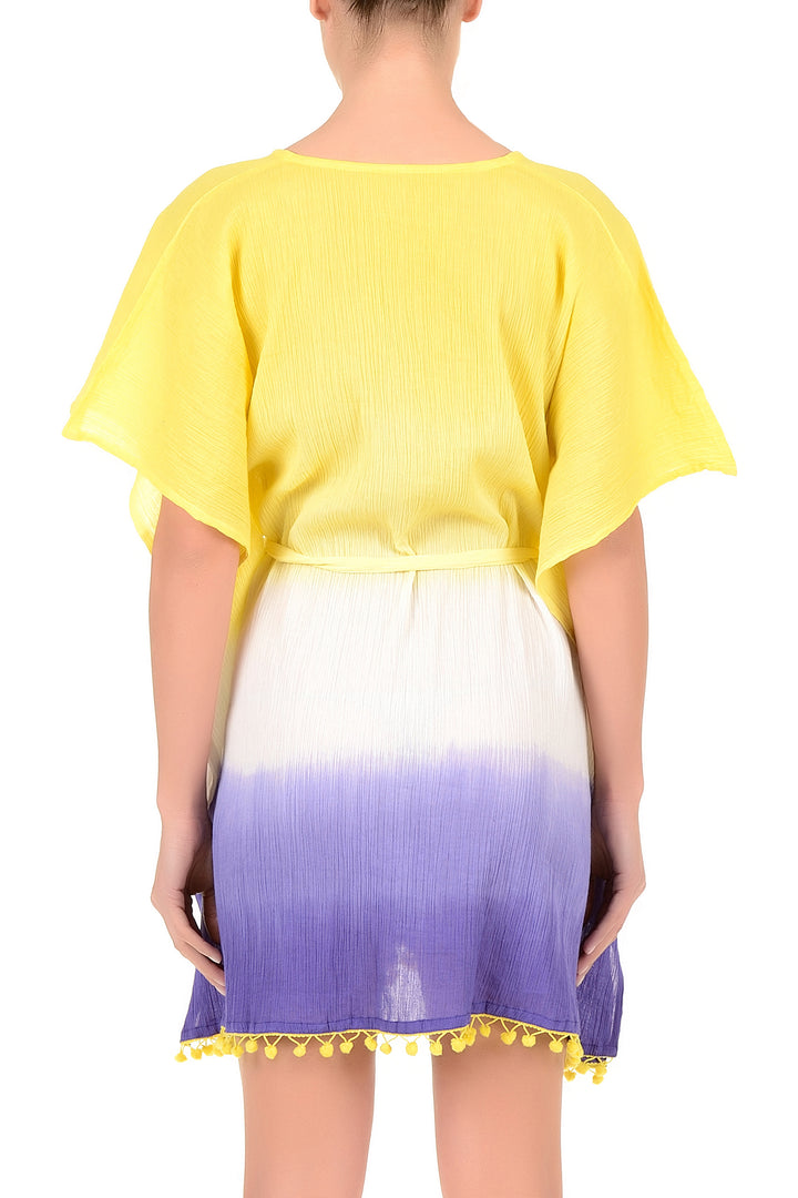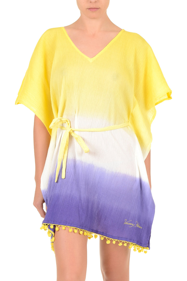 This cotton dress features an elegant V-neckline that enhances the silhouette, while the waist belt harmoniously defines the figure. The tassels on the hem add a touch of character and movement, making it perfect for those seeking style and comfort in a versatile garment. Ideal for casual and refined occasions.