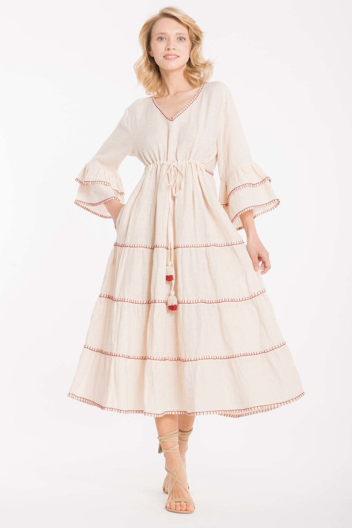 Dress in pure linen with a wide and comfortable cut, featuring a V-neck that enhances the silhouette. The drawstring at the waist allows for adjustable fit, while the ruffles on the sleeves add a touch of femininity. The contrasting details complete the design, giving it a sophisticated and natural elegance. Perfect for casual or summer occasions.