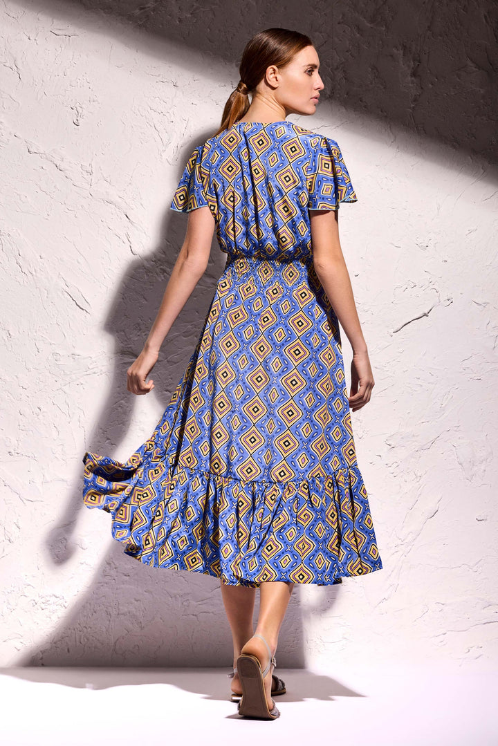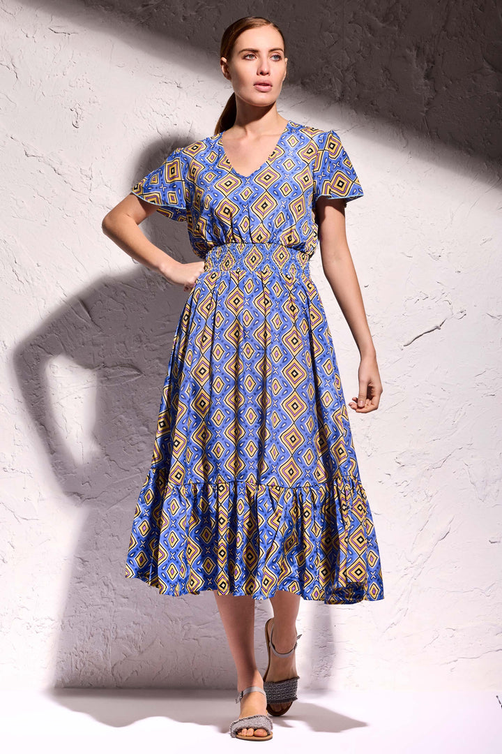 This long dress with a diamond pattern is perfect for those who want an elegant and fashionable style. The long model and the V-neck give a touch of femininity, while the short sleeves and the ruffled skirt add a touch of dynamism. The mix of length and pattern make it suitable for any occasion.