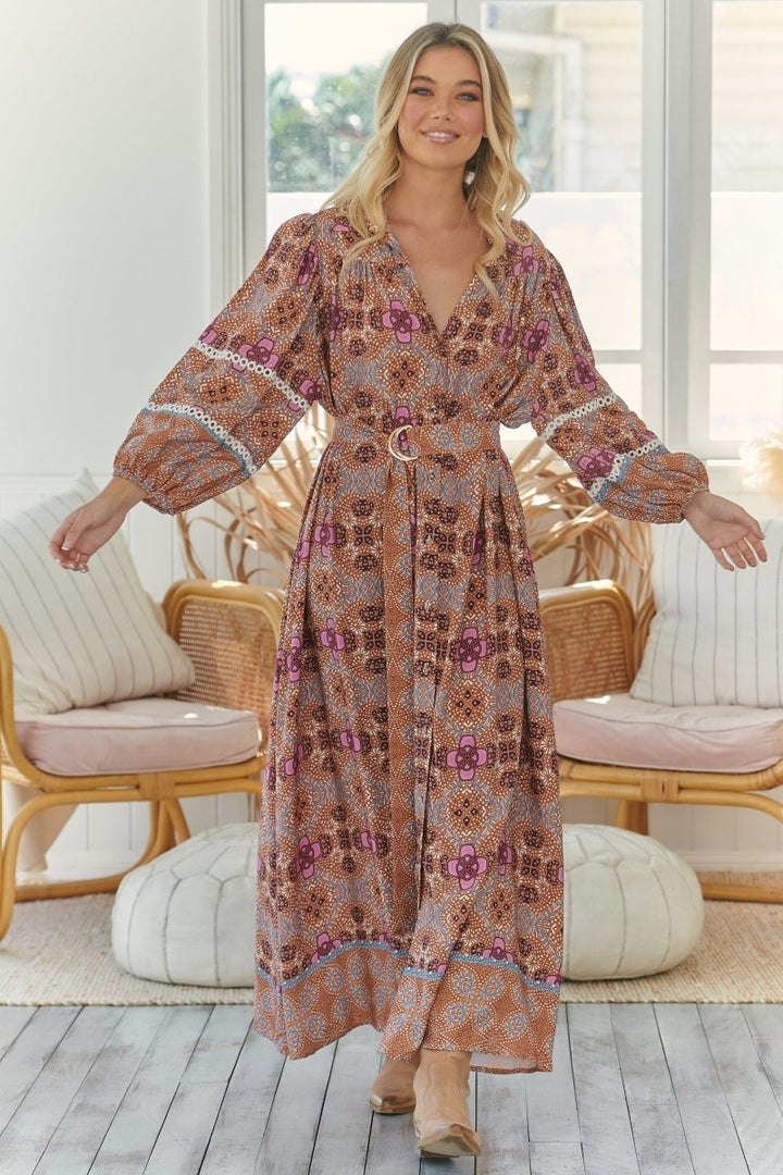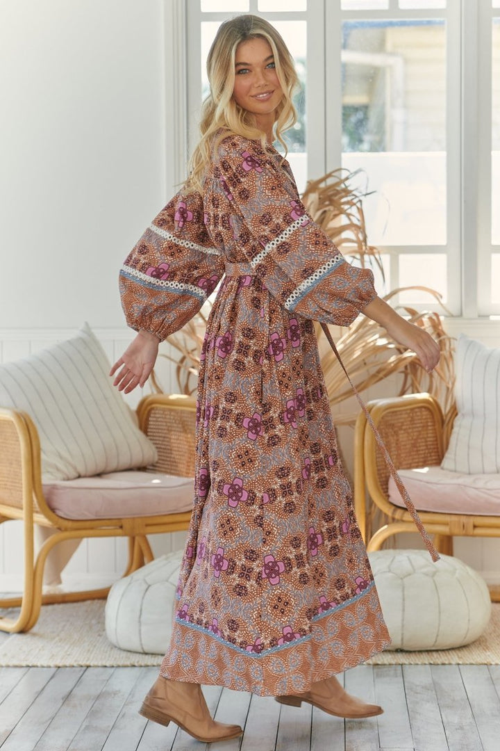 Long dress with a refined tile pattern, characterized by puffed three-quarter sleeves with inlaid lace details. The front buttoning and included belt emphasize the silhouette, while the flounced hem adds movement and lightness to the garment. Perfect for an elegant and sophisticated look.
