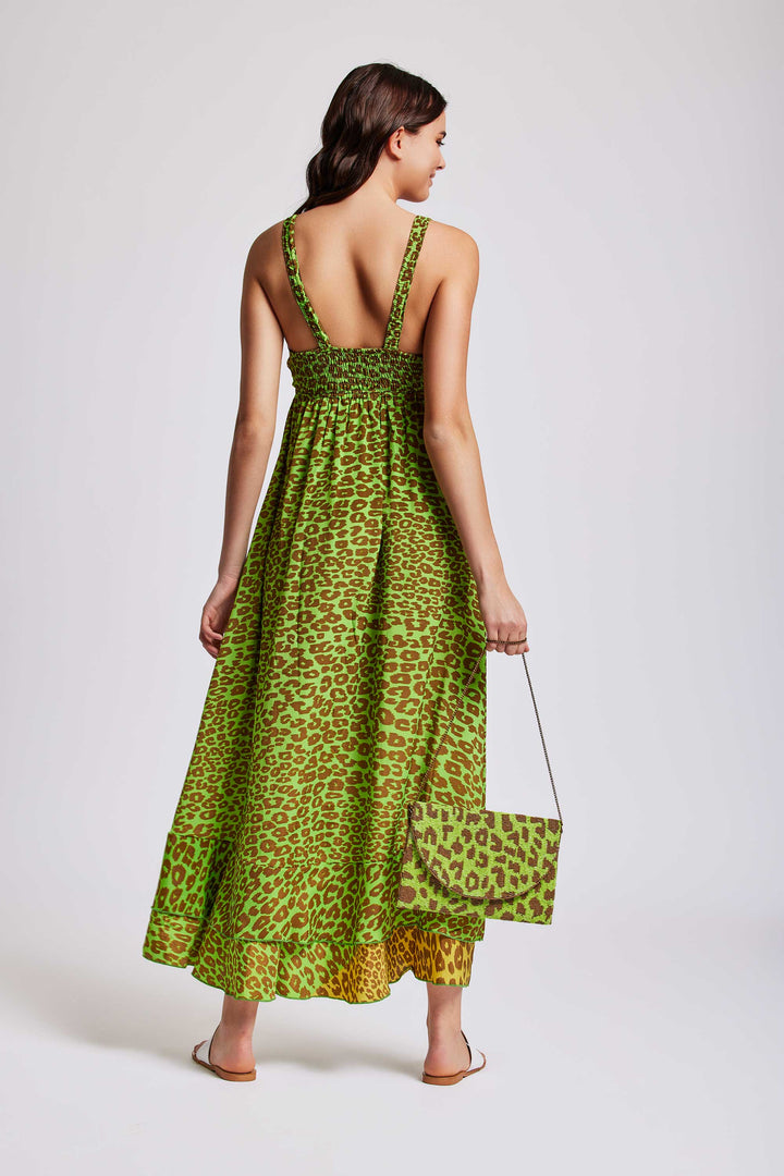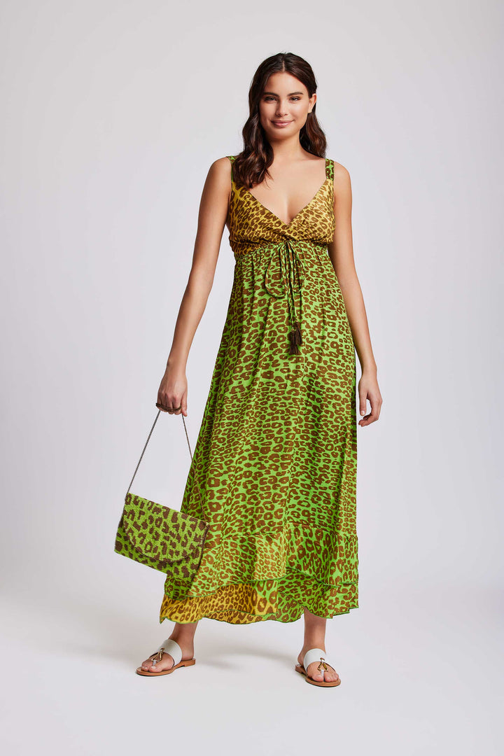 Enhance your beauty with the long green animalier dress. The model, with straps and a V-neck, enhances the silhouette with a fitted bodice and a long skirt enriched with a ruffle . The adjustable drawstring allows you to personalize the look. An exotic and refined print for an extra touch of elegance.
