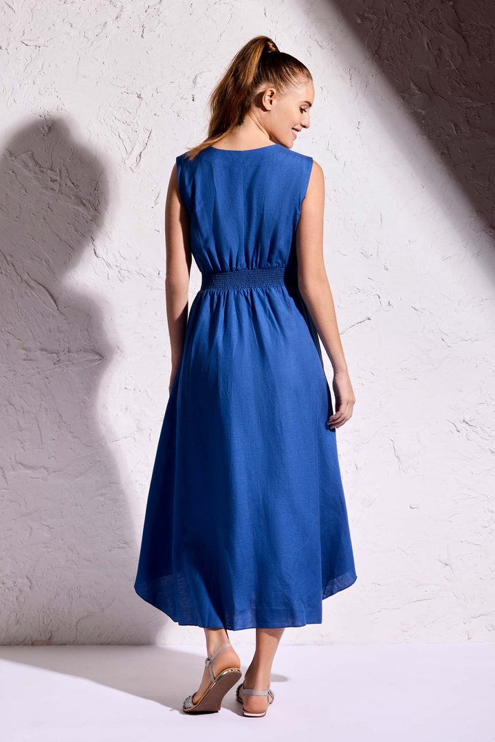 Dress long in linen blend, lightweight and fresh, perfect for the warm season. The sleeveless design and wide skirt offer comfort and freedom of movement. The V-neckline with buttons adds a touch of elegance, while the natural and breathable fabric ensures a feeling of freshness throughout the day. A versatile piece that can be easily paired for casual or more refined occasions.