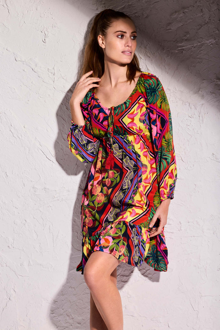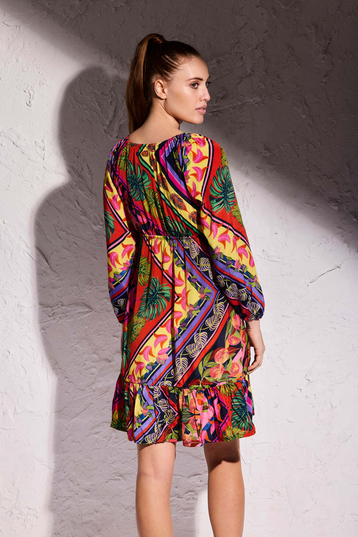 Dress with pattern pattern in vibrant colors. Balloon sleeves and adjustable neckline. Elastic at the waist for a perfect fit and a final ruffle that adds movement to the skirt.