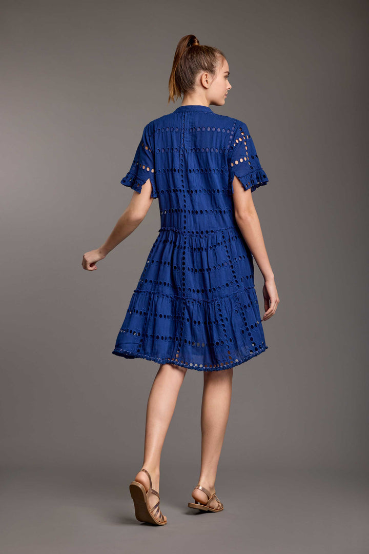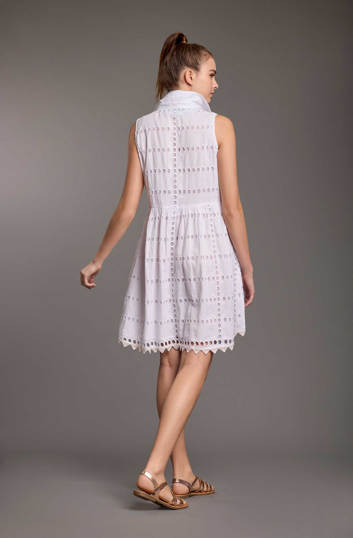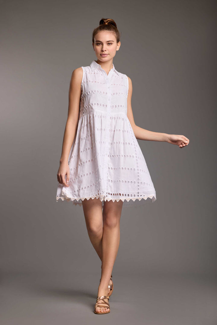 Dress without sleeves in pure cotton lace. With a collar and buttons in front, available in white and navy blue, it is perfect for warm days. Mini design for a touch of elegance on any occasion.