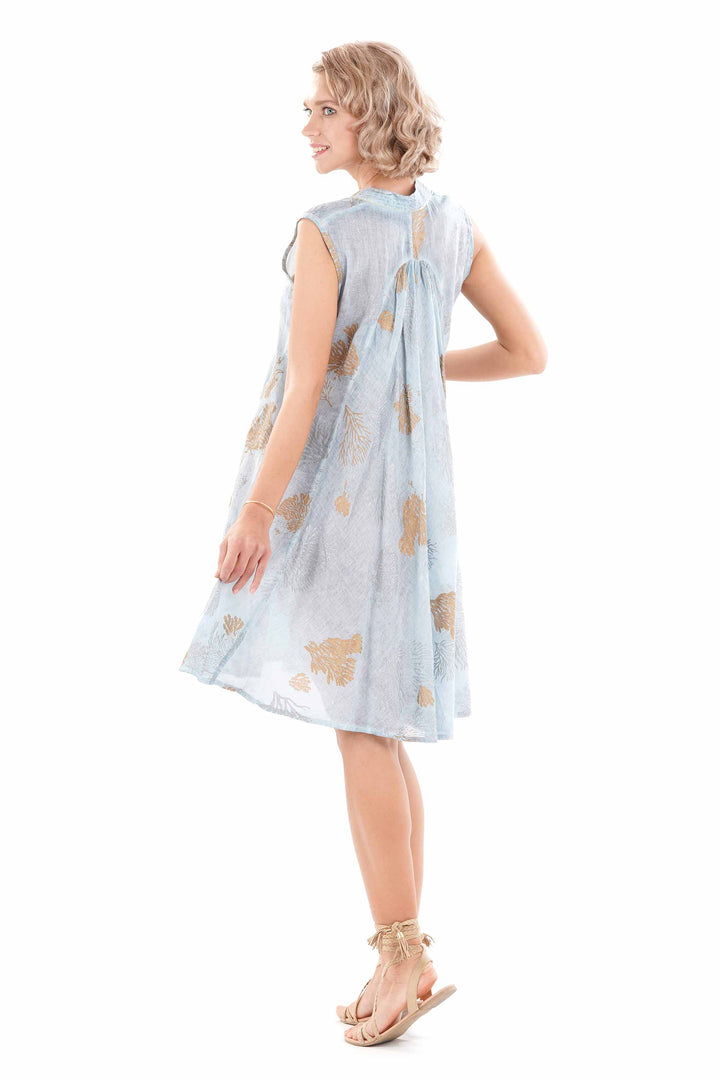 Refined sleeveless dress made of pure high-quality cotton. The design features an elegant V-neckline that elongates the figure, while the exclusive coral print evokes the marine depths of the Mediterranean. Enhanced by meticulous sequin embroidery that catches the light with every movement, this garment represents the excellence of craftsmanship, combining comfort and sophistication for prestigious summer occasions.