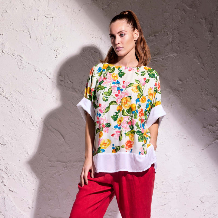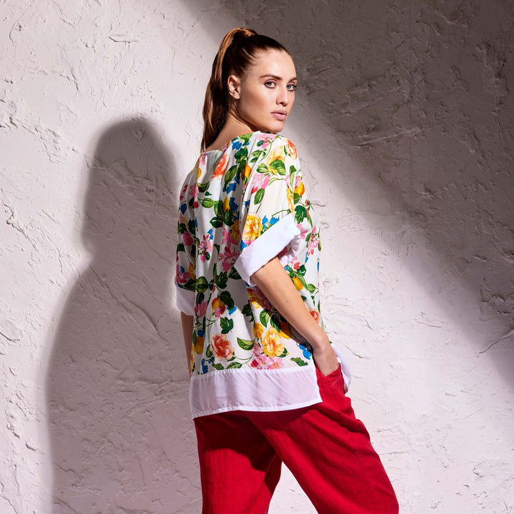 The floral blouse is perfect for an elegant and fresh look. The pattern and the rolled-up half sleeves add a feminine touch. Thanks to its comfortable fit and lightweight fabric, it is perfect for any occasion.
