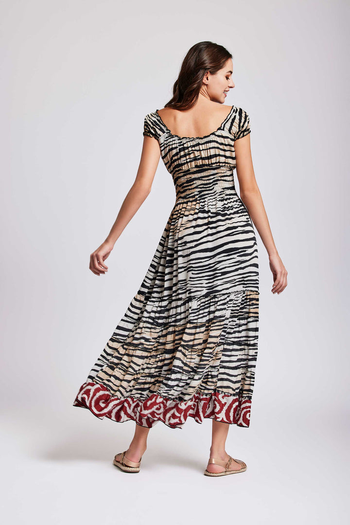 Let yourself be conquered by the wild elegance of the long tiger dress. Thanks to its deep V-neck, short balloon sleeves and ruffled skirt, you will feel confident and glamorous. Inspired by nature, this dress is perfect for those who love a unique and refined style.