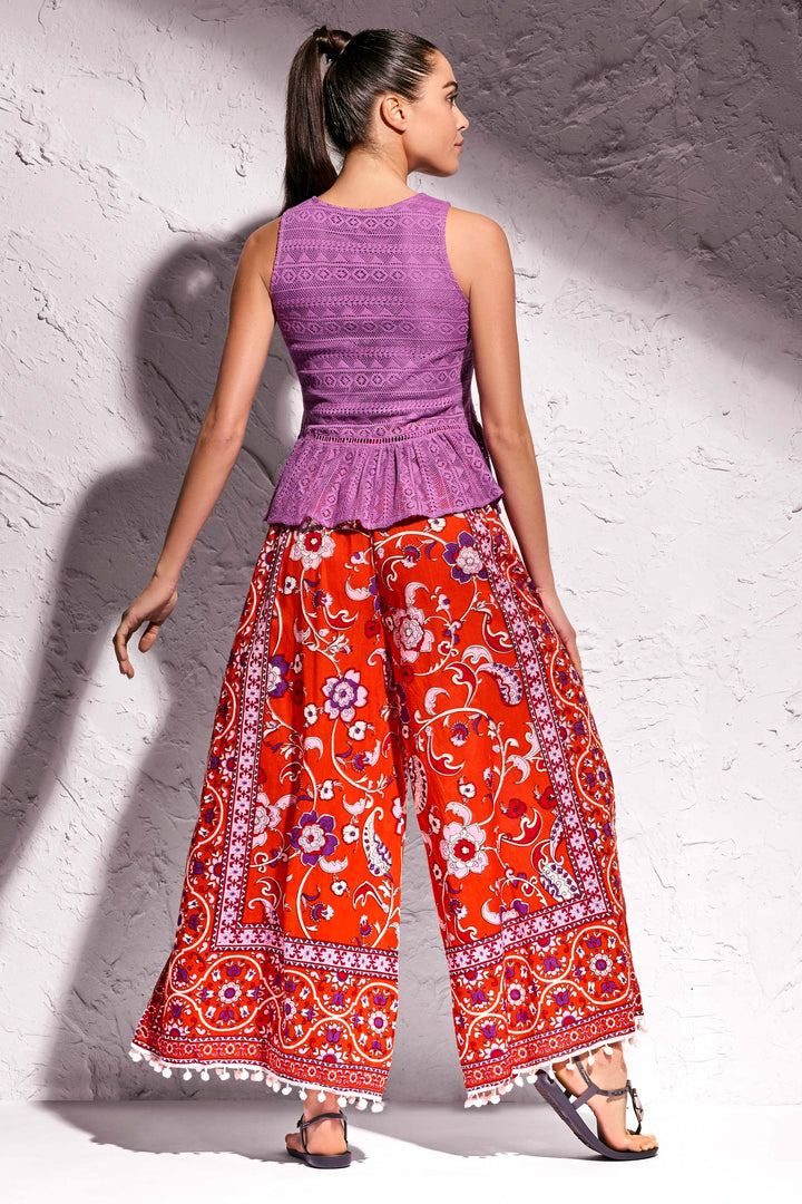 These ethnic pattern palazzo pants will be the perfect choice for those looking for comfort and style. Their palazzo design and drawstring waist offer optimal comfort, while the trimming at the bottom makes them unique. Add a touch of color to your wardrobe with these trendy pants.