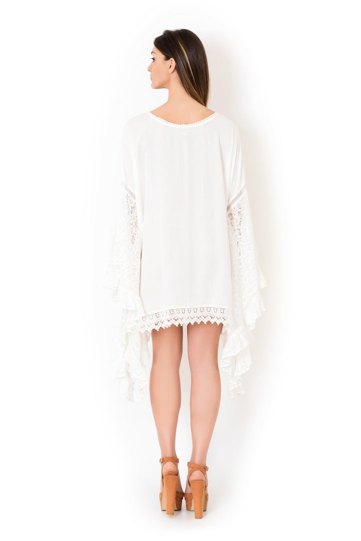 This elegant white poncho features long batwing sleeves and intricate lace embroidery, combining comfort and sophisticated details. Its fluid design offers ease of movement, while the delicate lace adds a refined texture, making it a versatile piece for both casual and formal occasions. Perfect for layering, it enriches your wardrobe with a touch of timeless elegance.