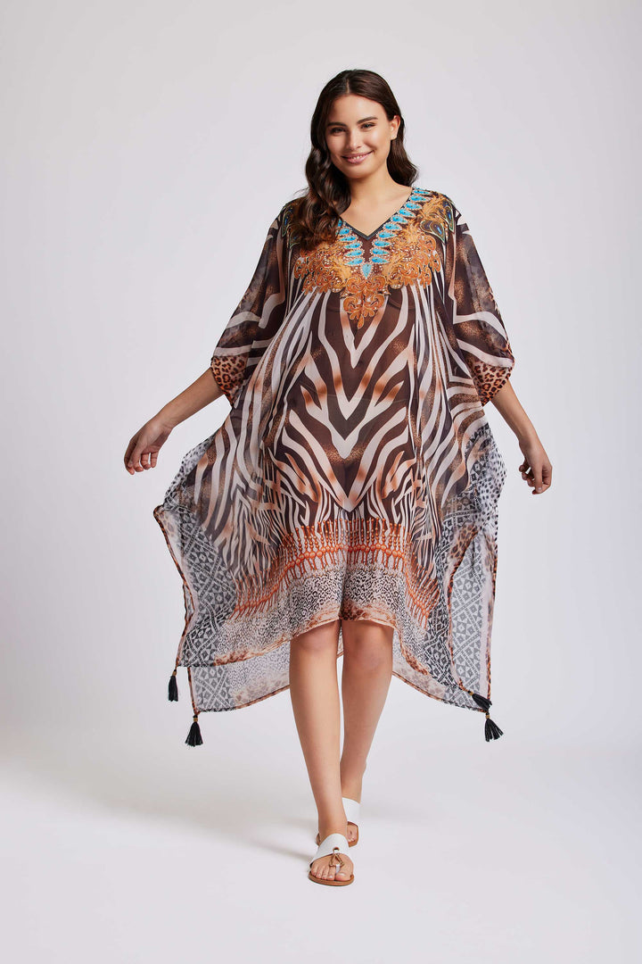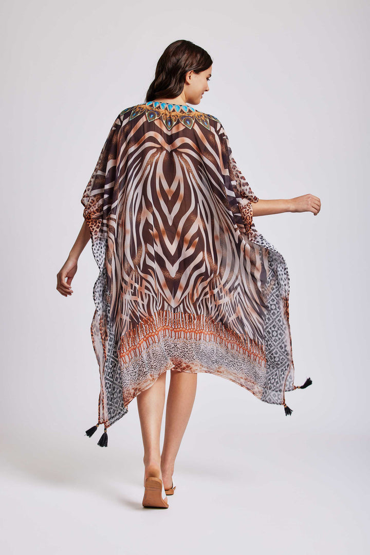 Give a touch of luxury to your look with the Animal Print Long Poncho. Crafted with hand-stitched crystal detailing and an elegant V-neck, this poncho will add a touch of elegance to your outfit. With its batwing sleeve design and tassels at the ends, this poncho is a must-have for any passionate fashionista.