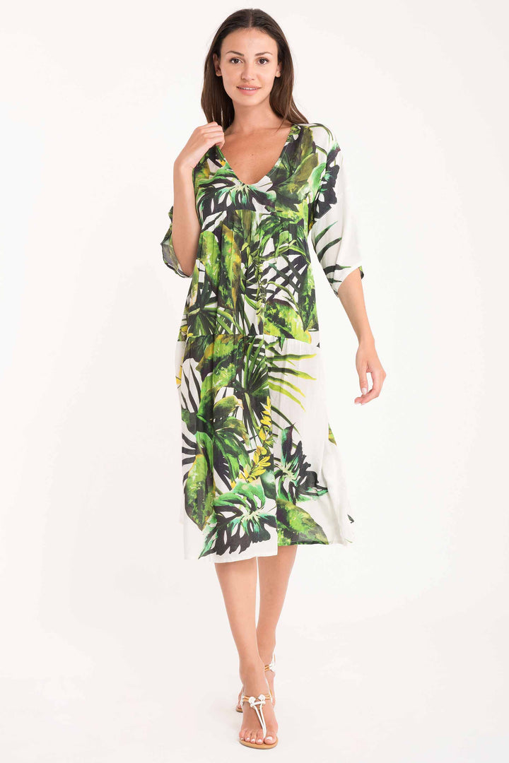 El caftán largo tropical está caracterizado por una vívida fantasía tropical que captura la esencia del verano. El diseño amplio y cómodo garantiza libertad de movimiento, perfecto para días en la playa o noches en la ciudad. Una prenda versátil que se adapta a múltiples ocasiones, desde la playa hasta los aperitivos de verano, manteniendo siempre un aire sofisticado y contemporáneo.