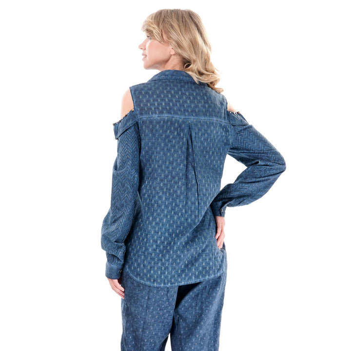 Cette chemise à manches longues présente un élégant design décolleté aux épaules : associée à un effet denim exclusif, elle offre une touche contemporaine au vêtement décontracté classique. Conçue pour garantir confort et look moderne, elle équilibre une coupe décontractée avec une touche raffinée, la rendant idéale pour un style polyvalent du jour à la nuit.