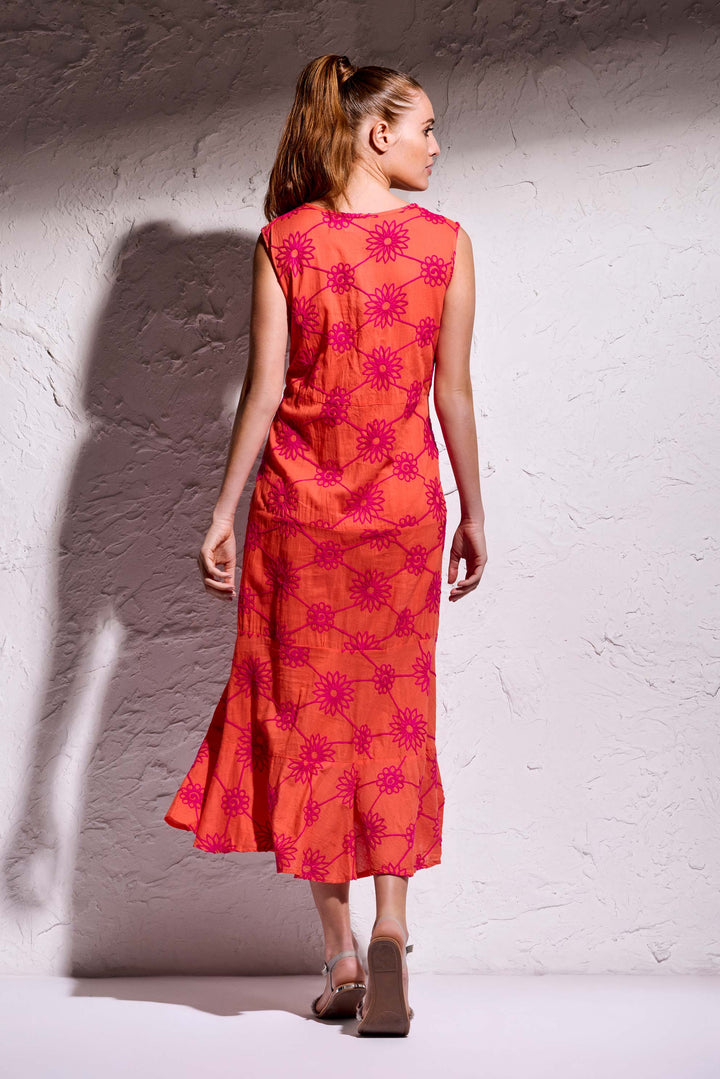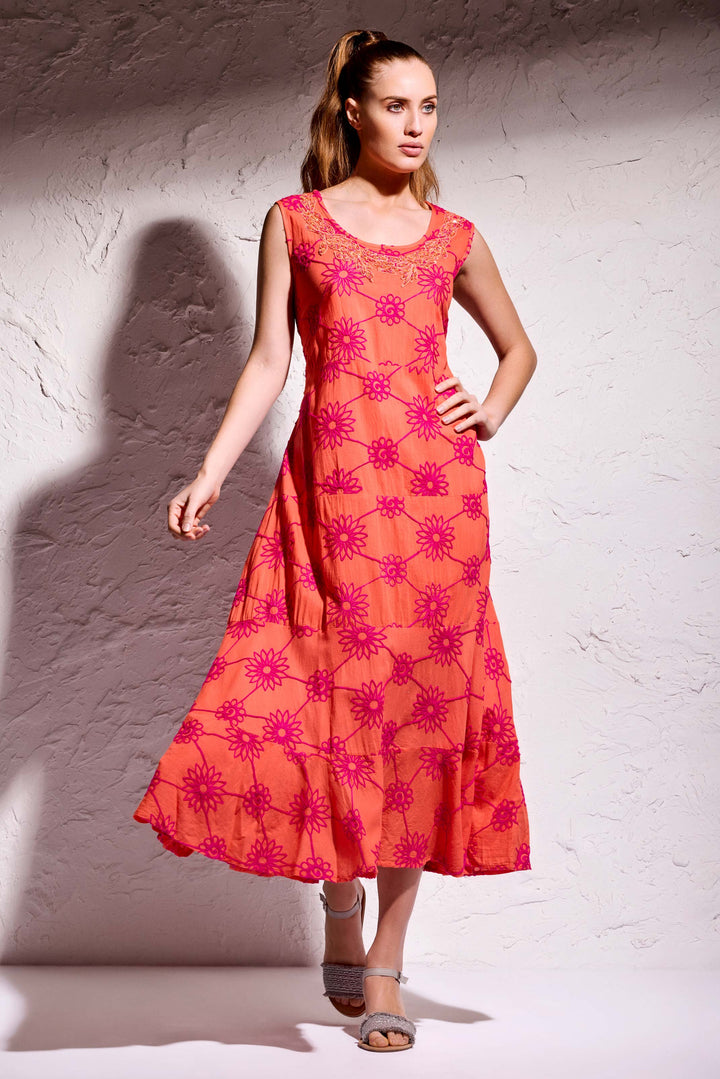 Cette robe longue, confectionnée en tissu pur coton, est parfaite pour un look élégant et confortable. Grâce aux applications cousues main et aux coutures douces, il s'adapte parfaitement à la silhouette. Le haut sans manches le rend adapté aux occasions formelles et informelles.