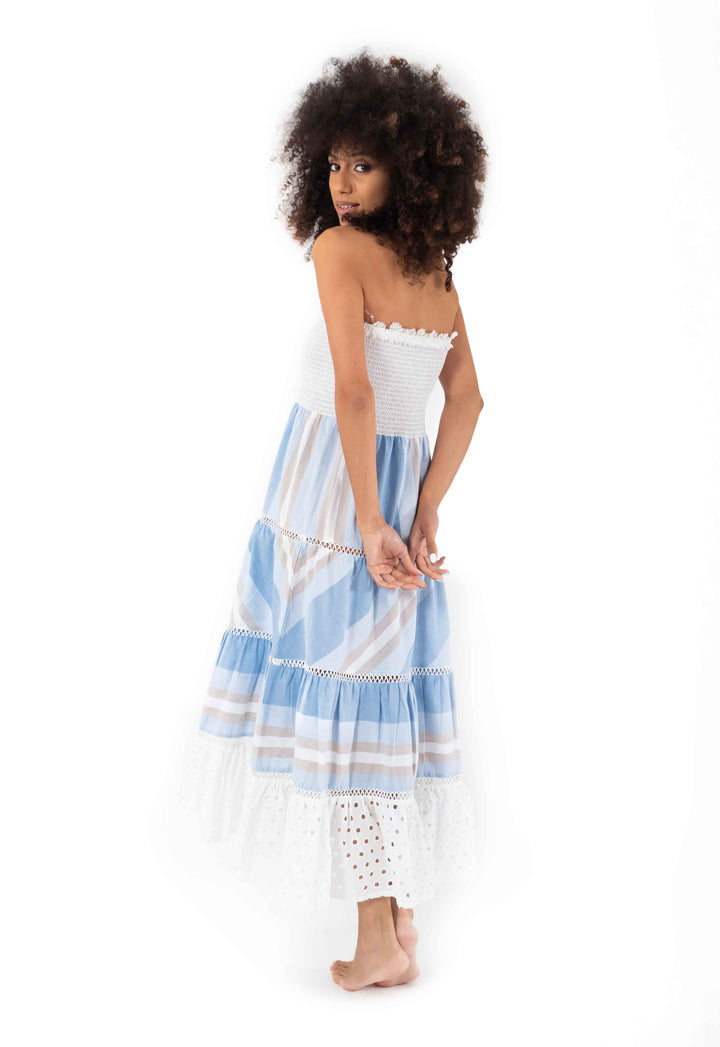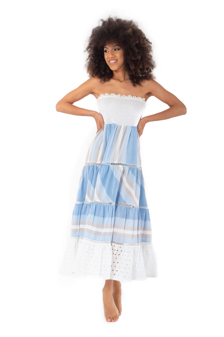 Amusez-vous avec votre look avec cette robe longue en lin rayée. Le tissu naturel et léger assure un confort incroyable, tandis que les empiècements en dentelle et les coutures douces ajoutent une touche féminine. Le buste froncé et le bas en dentelle lui confèrent une élégance unique. Un incontournable pour chaque femme !