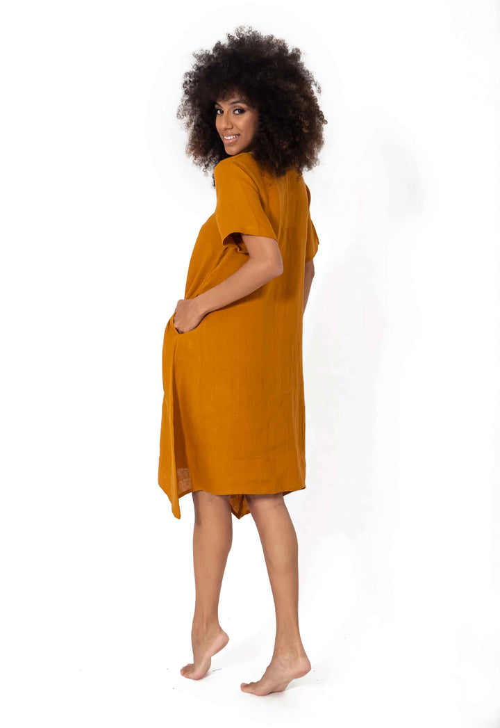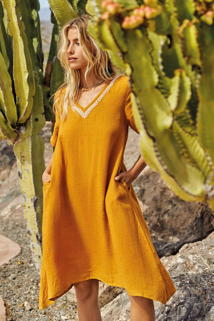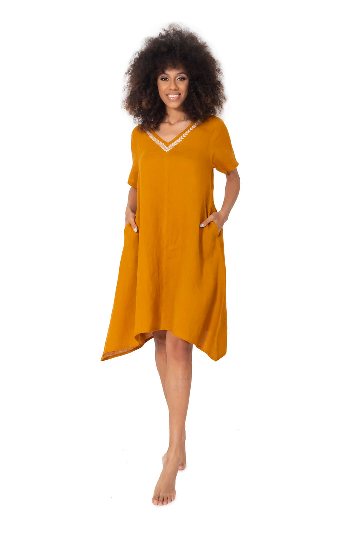 Cette robe en pur coton et lin présente un motif brodé à la main qui la rend unique. Doté d'un col en V et de manches courtes, il présente une longueur moyenne et des poches cachées pour une touche de praticité. Le bas ondulé ajoute une touche d'élégance à ce vêtement polyvalent.