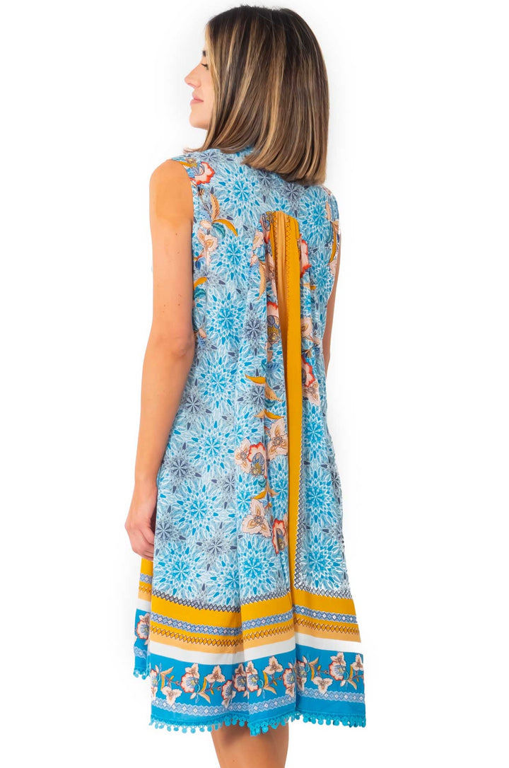 Questo abito a fiori e maioliche dona eleganza e raffinatezza. Lo scollo a V e gli inserti di merletti lo rendono unico e di classe. Perfetto per ogni occasione, smanicato e di lunghezza media. Un must-have per chi ama lo stile sofisticato e femminile!