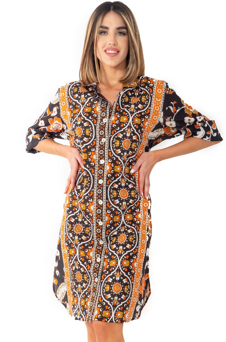 Con l'abito camicia fantasia etnica, aggiungi un tocco di eleganza e stile al tuo look. La lunghezza media e la linea ad A offrono una vestibilità comoda e favorevole per ogni taglia. I bottoni davanti e le maniche a 3/4 lo rendono perfetto per ogni occasione.