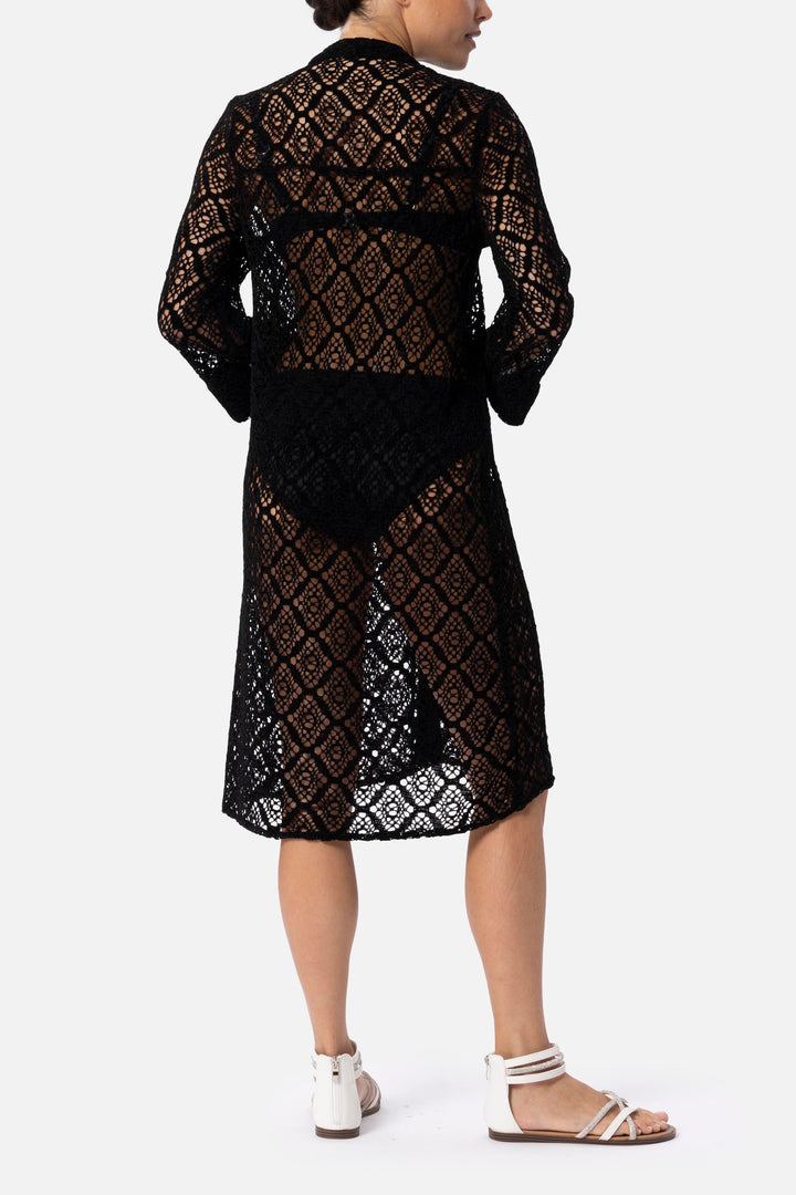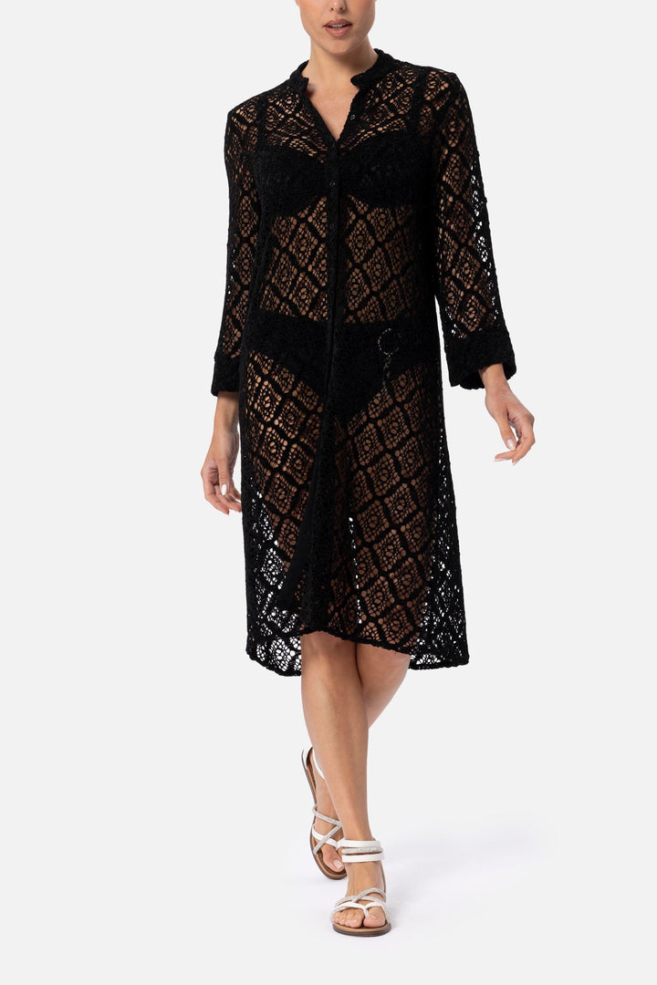 L'abito camicia Grace a in tessuto di pizzo macramè nero è perfetto per un look estivo leggero e versatile. Con il colletto e i bottoni davanti, offre uno stile casual chic ideale per un look da spiaggia o casual. Lunghezza midi per una vestibilità comoda e alla moda.